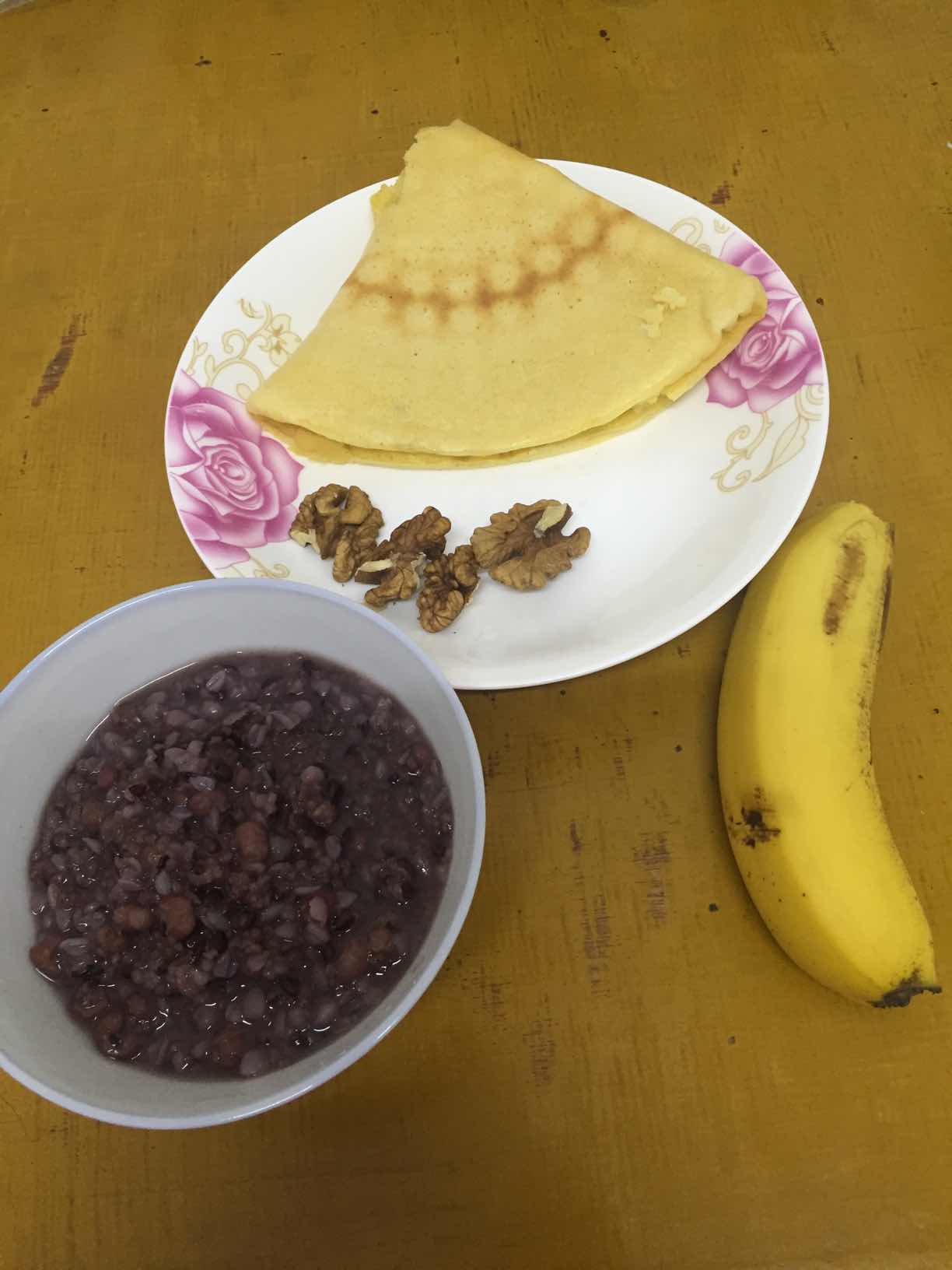 一般我都不好意思晒早餐,因为没有姐妹们的营养全面哦,今天也要心血来潮,亲,你们看看,简单吧,一碗杂粮粥,一块玉米面加面粉发酵的自己做的饼,几颗核桃,一根香蕉。