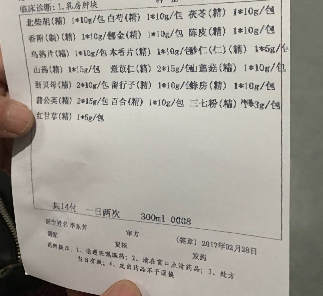 你的方子上写的是:临床诊断:乳房肿块。我感觉你的药方不对。你不是乳ai吗?