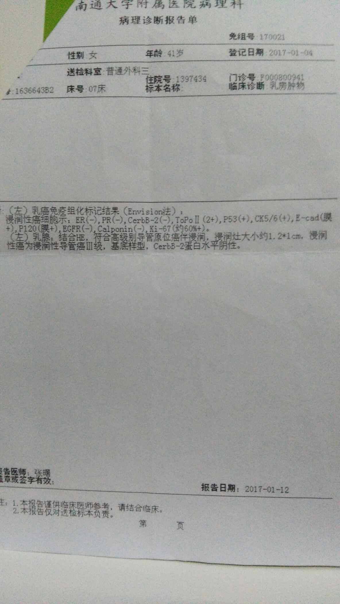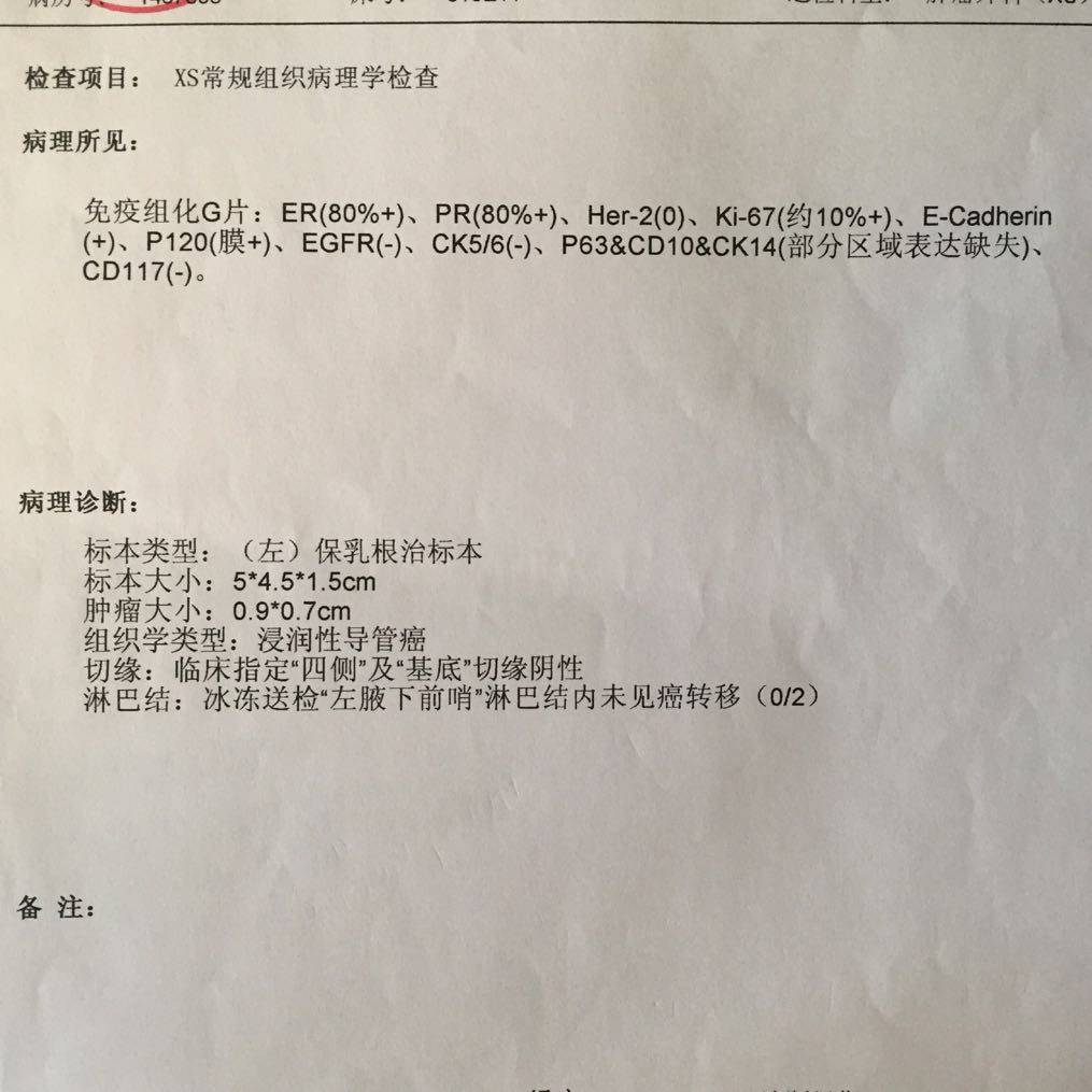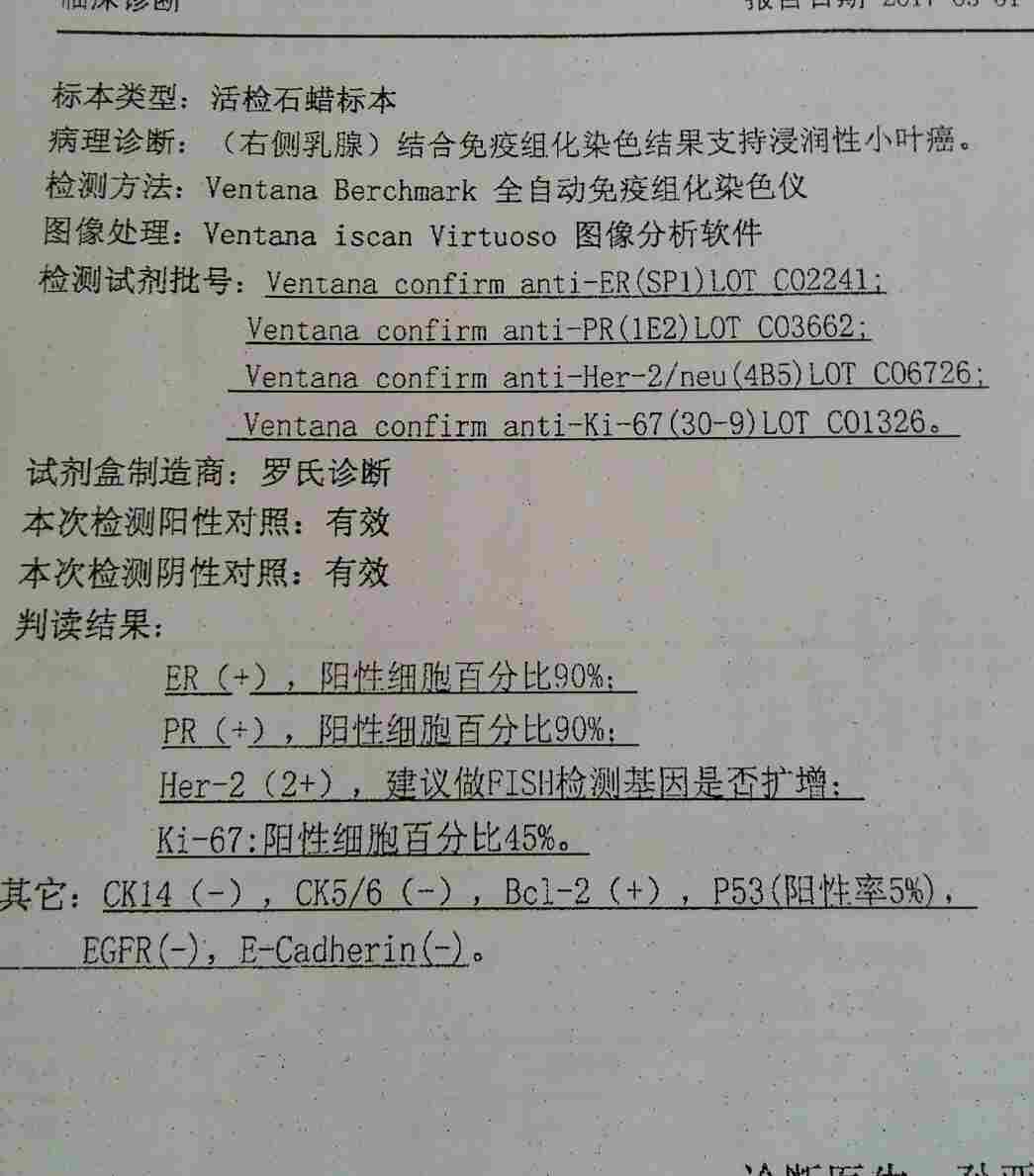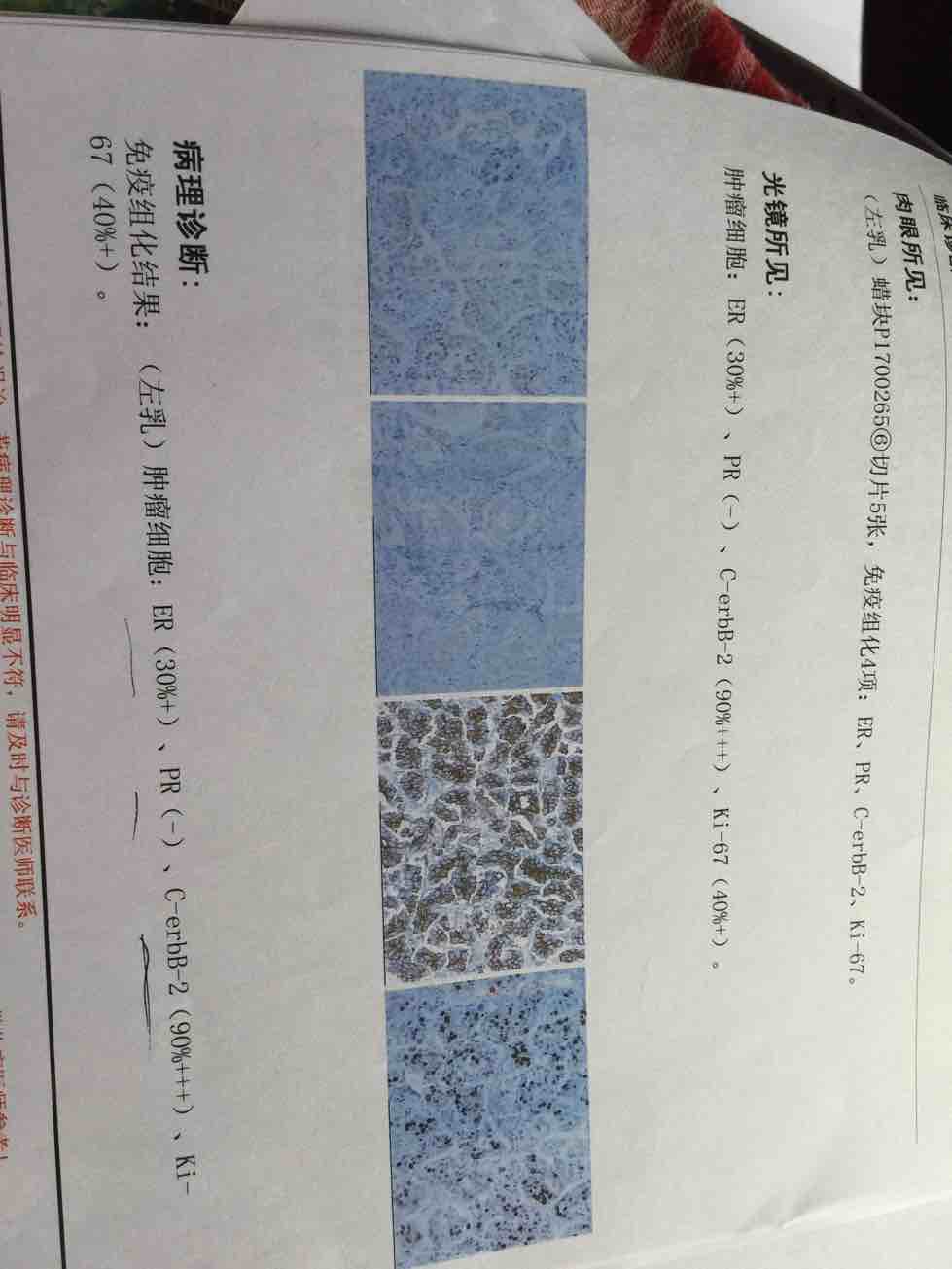 我和你差不多也是ER和PR阴,HER2是2 要靶向冶疗,也是写的高级别浸润性导管癌。现在也没搞清楚高级别是什么意思。