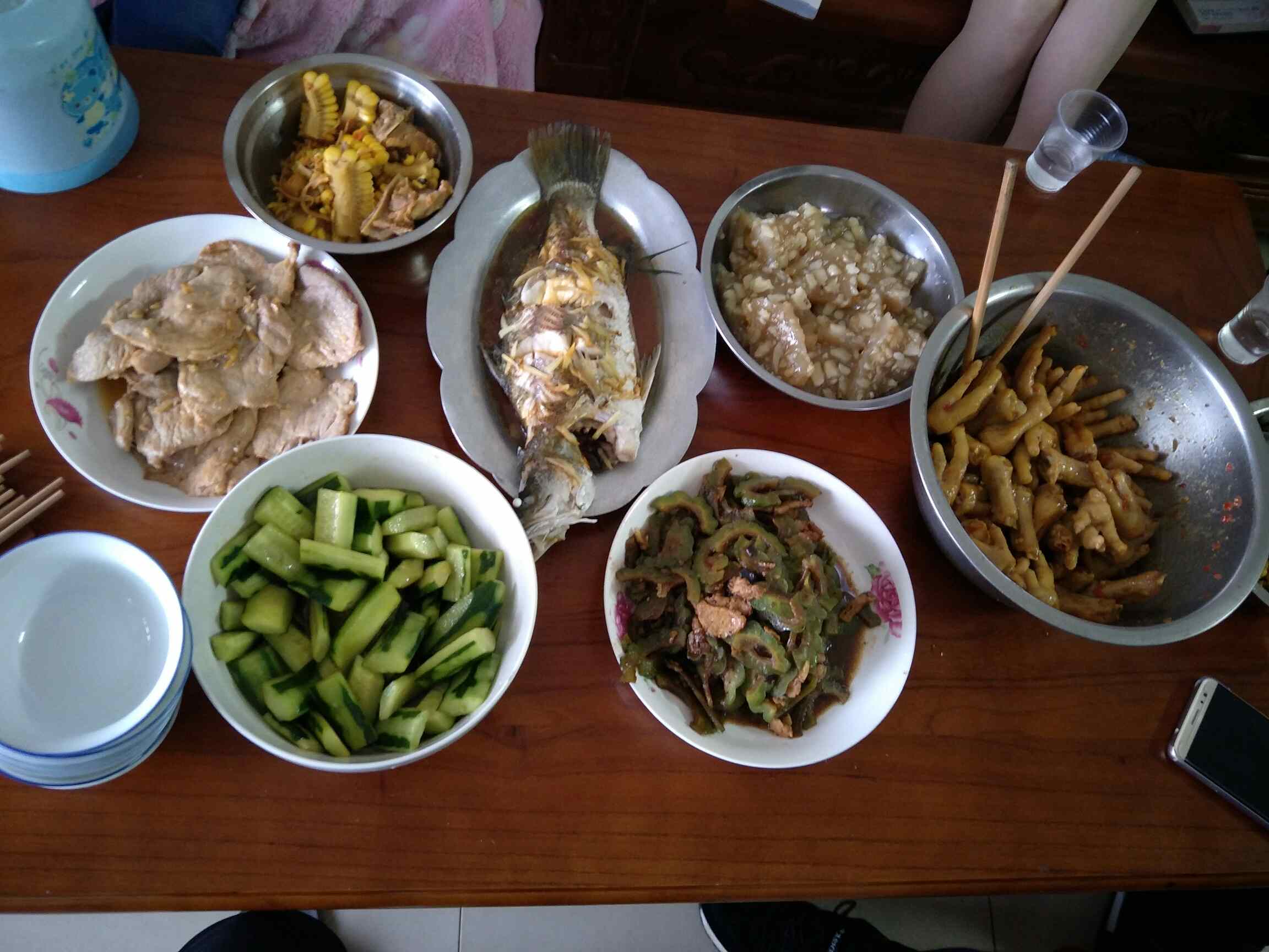 虫草花干贝玉米汤,凉拌鸡脚,凉拌青瓜,炒苦瓜,蒸盲槽鱼,煎猪扒,就这样啦!