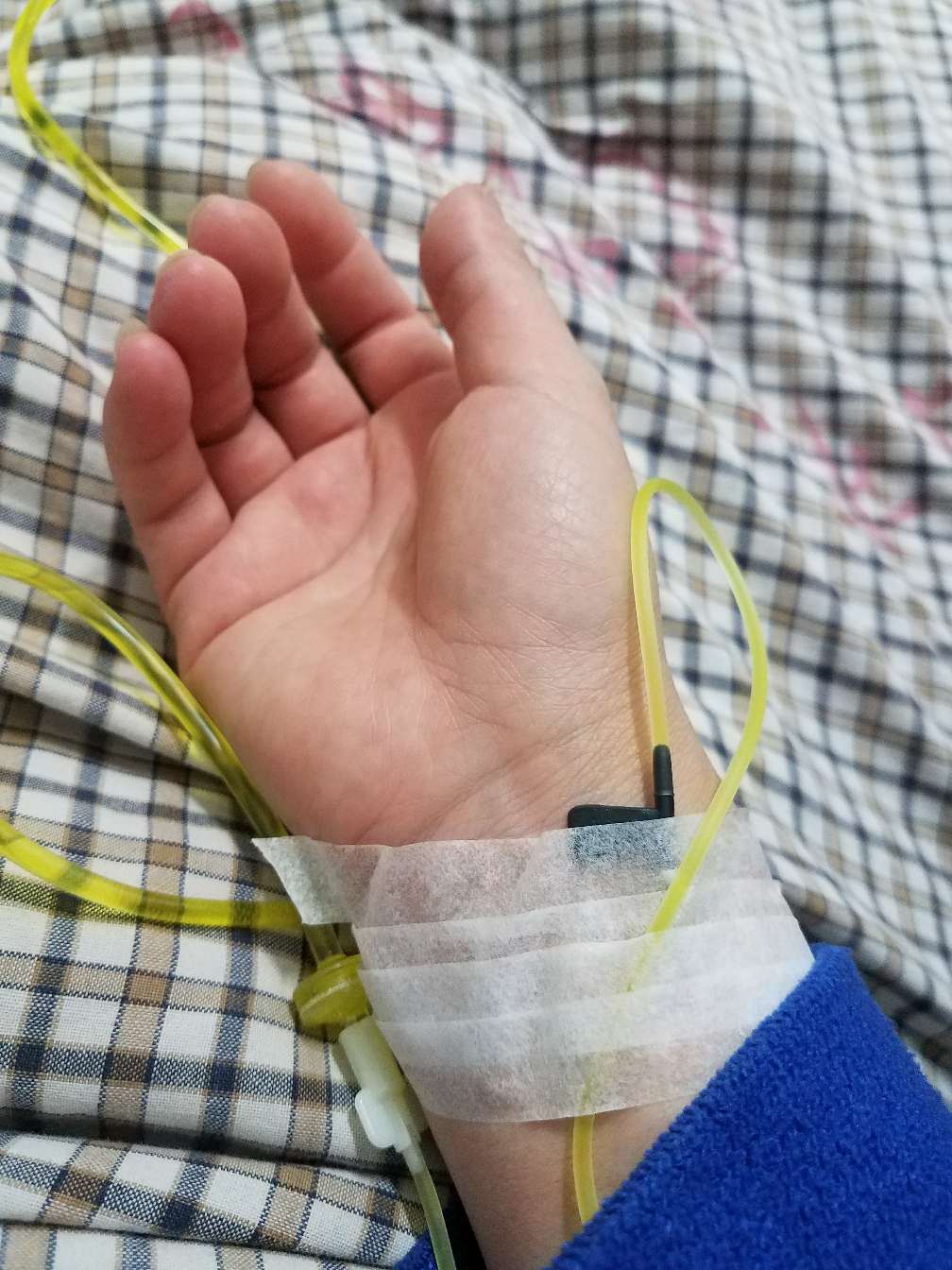 几天的时间,吃喝不消化,瘦了很多,现在变成102斤了!脸色也不好了,插着胃管,为了不吓到你们,我拿条丝巾盖住了!