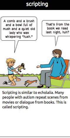 脚本重复(scripting)和鹦鹉学舌(echolalia)很像。很多自闭症患者重复电影场景和书上的对话。