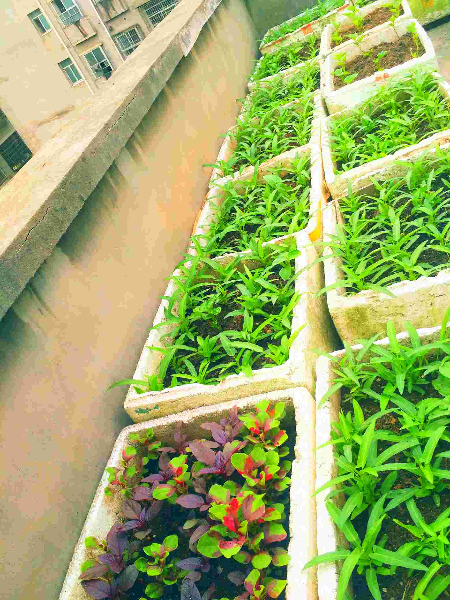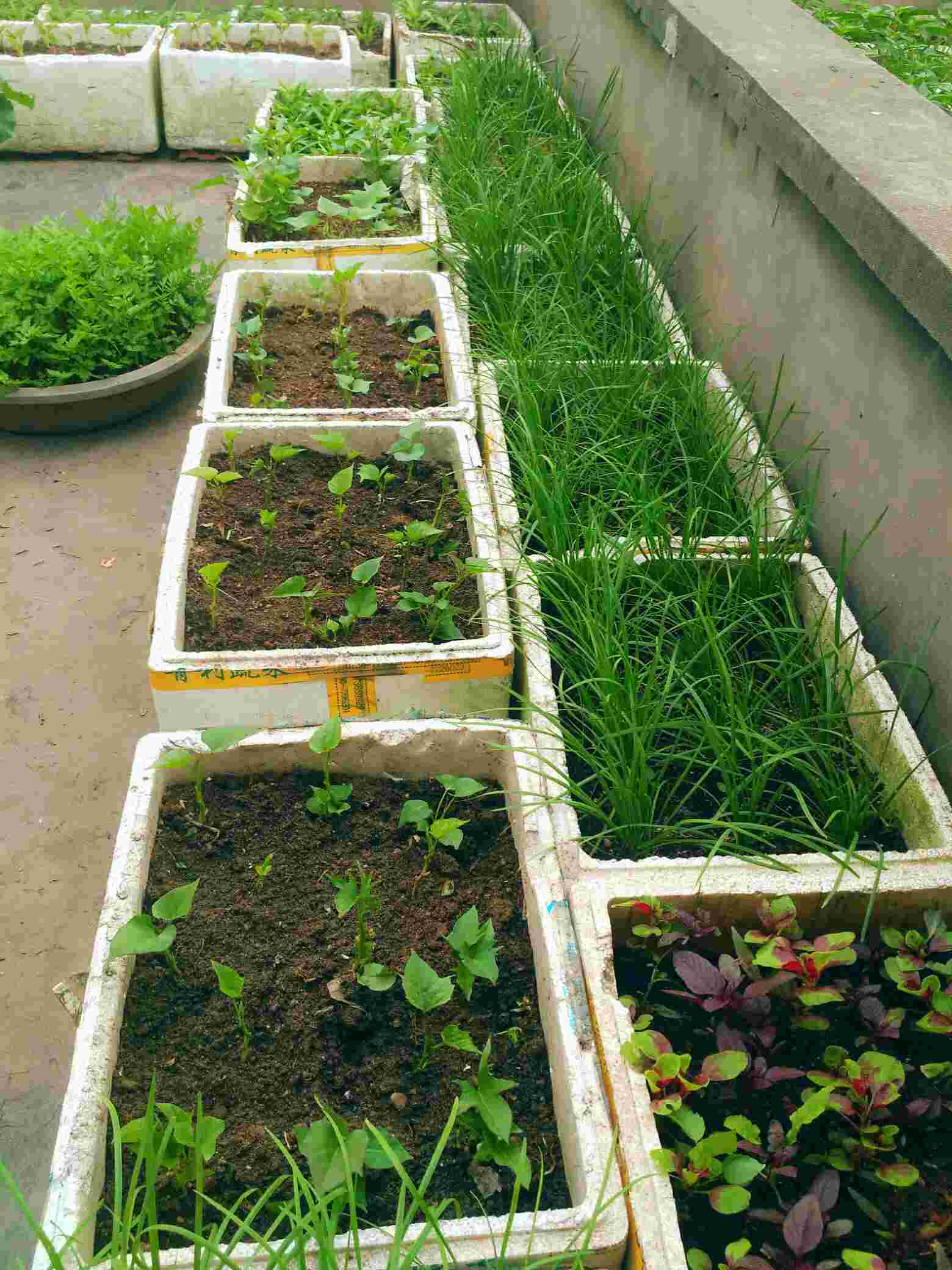 菜长得真好,但建议以后少用泡沫箱种菜,可以改用大的花盆试试