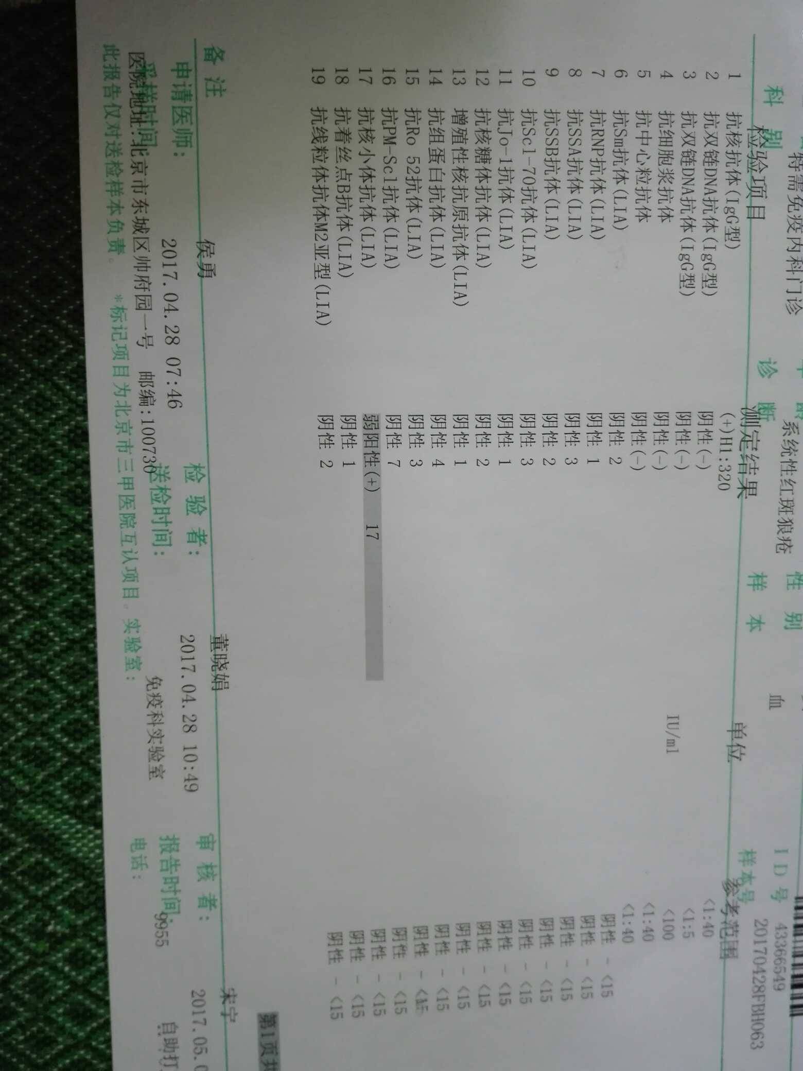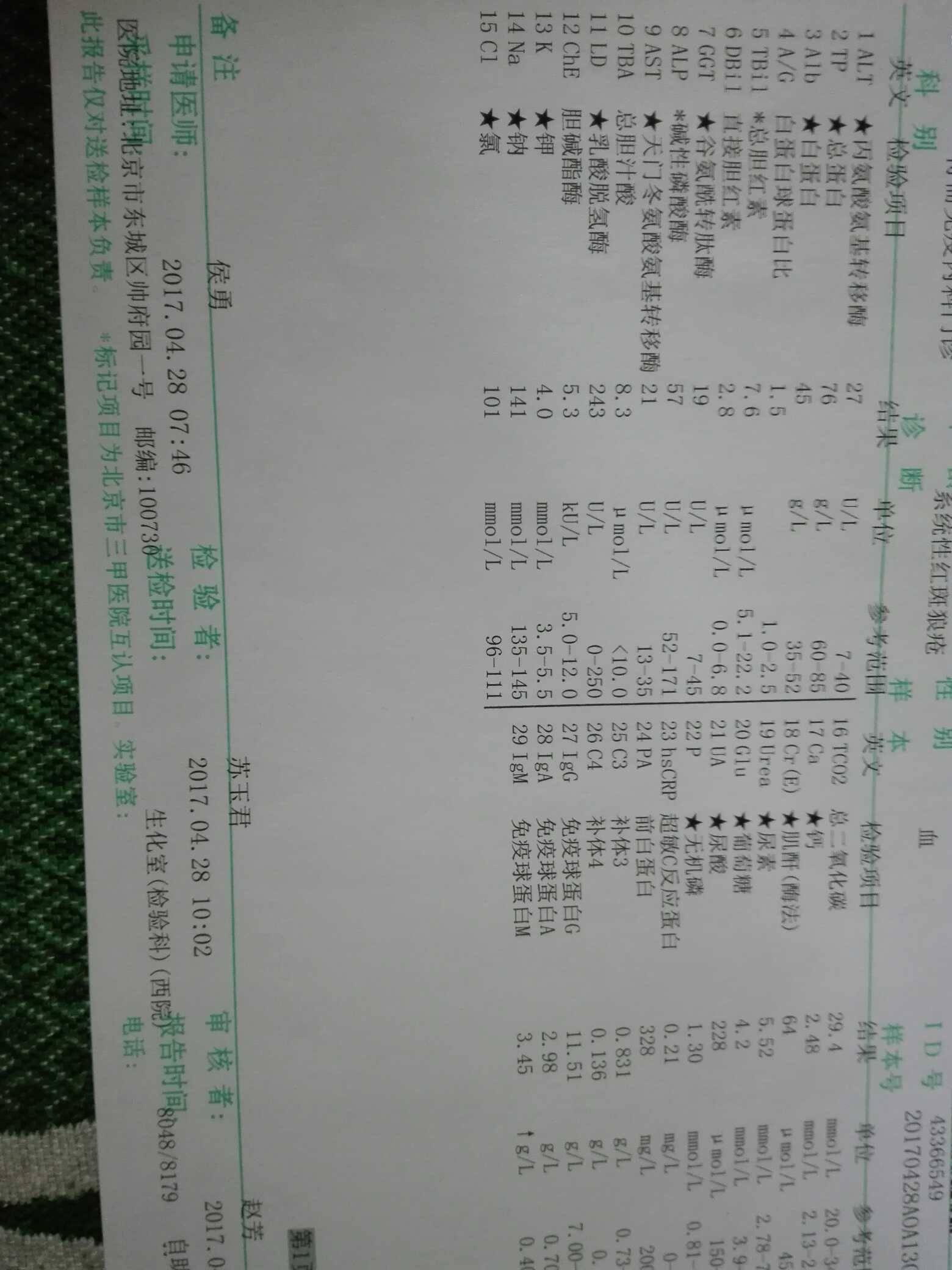 1个多月前查出来系统性红斑狼疮的时候,白细胞白蛋白略低,血沉25,肝功能中的丙氨酸氨基转移酶101,比正常值高二倍。吃了一个月的泼尼松片,每天12片。 前几天再去复查,白细胞白蛋白正常,血沉变成9也正常了,丙氨酸氨基转移酶变成27也回复正常,抗核抗体也由1:640变成了1:320,抗核小体抗体由阳性变为了弱阳性。 大夫说控制的不错,激素每周减一颗。