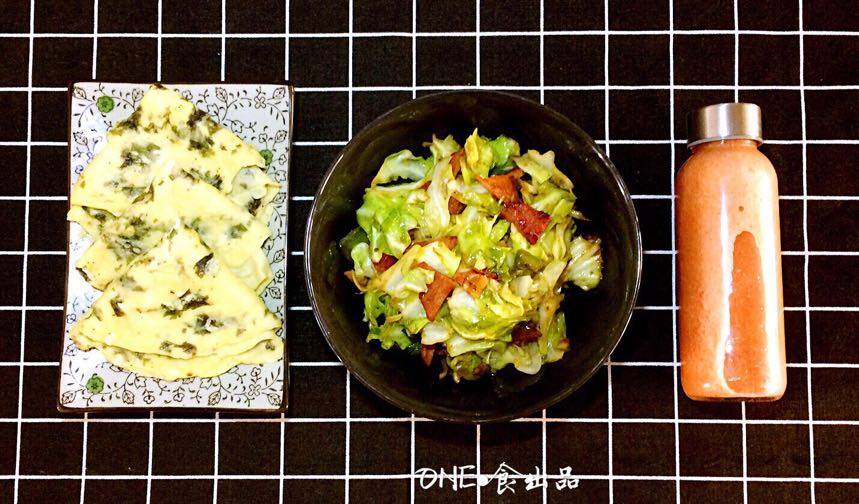 今天是培根甘蓝和紫菜饼。紫菜掰小块泡水,加鸡蛋、面粉、虾皮,和成面糊