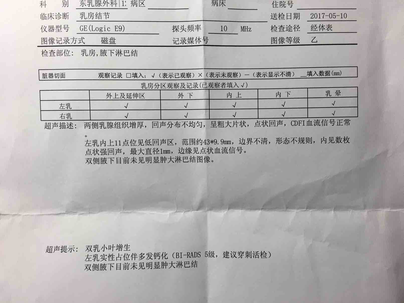 母亲70岁了,前几天去体检,b超医生说乳腺看上去不好,让她去大医院再复查一下,结果昨天查出来BI RADS5级,这是下乳腺癌晚期的判决书了么?在医院办了住院预约做穿刺活检,今天也没来通知入院。想在这里先咨询一下各位姐妹这种提示多数会是个什么情况,附上B超报告,谢谢大家