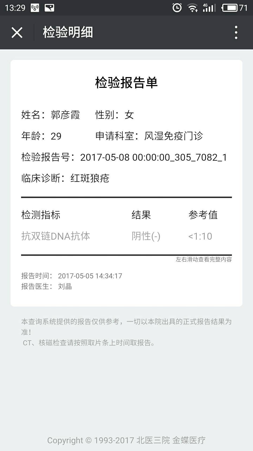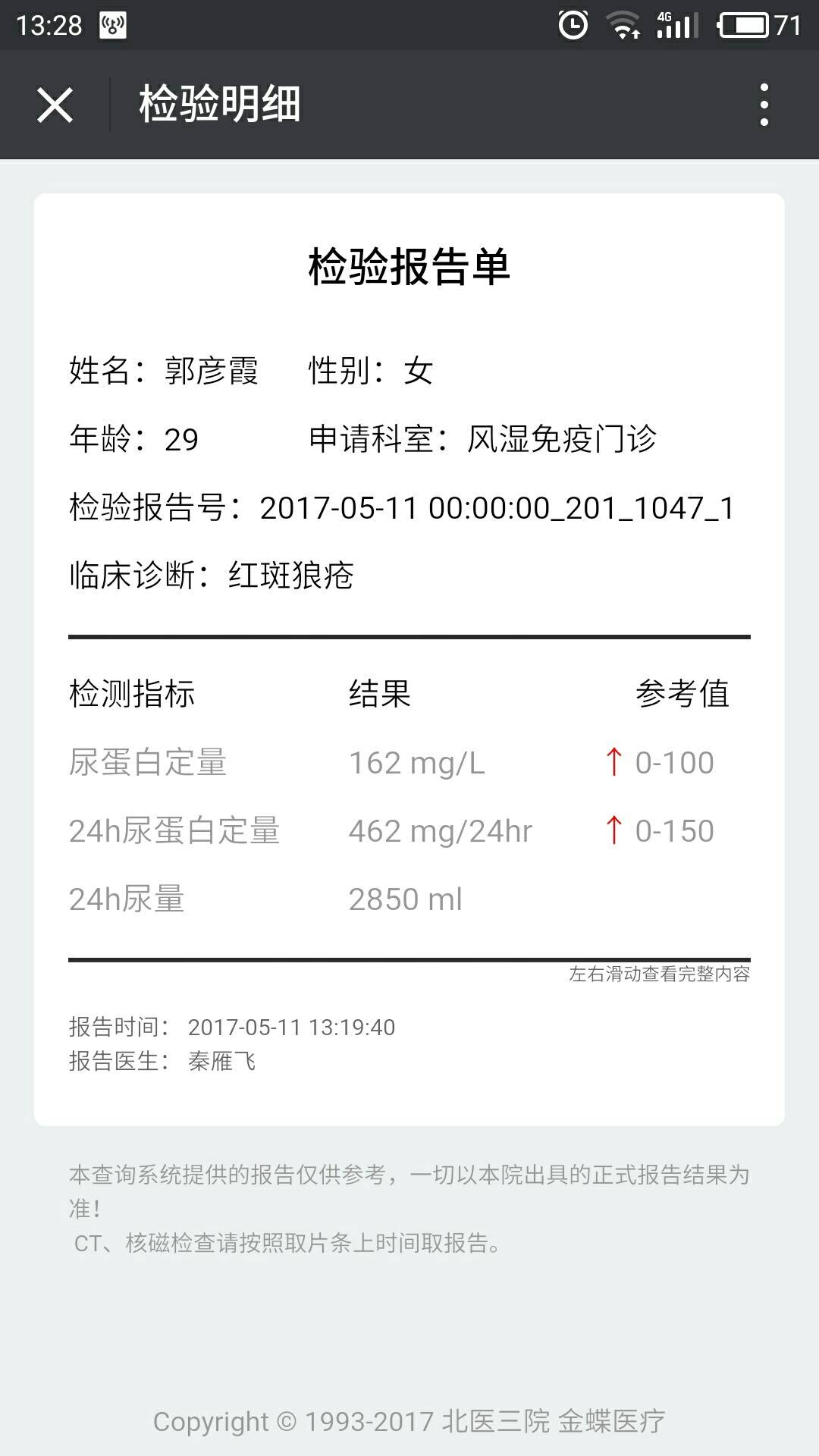 。复查了五项其他四项的结果都已经出来了,我自己看着不好但是也没怎么坏吧,补体3还是稍微低,但是比上次好点,24小时尿蛋白462毫克,比3月份家里查的那次1006毫克好(其实我都没家里那次不准,因为我把两次晨尿都留了),抗双链dna是阴性,还差那个T/B/NK细胞绝对计数没出来,说是要一周,可是今天就一周了啊,该不会出不来吧?