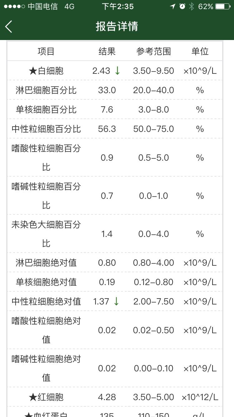 白细胞只要不低于1.8就问题不大。白细胞低坚持每天散步就会升起来,我之前就是白细胞低,现在每天晚饭后散步半小时,现在都升到4以上了。