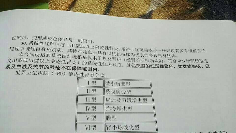上面说的很清楚,分型是对累及损害肾脏的分型,累及到肾脏的狼疮性肾炎III型以上才可以,你的比较轻,没有累及到肾脏,也不用做肾穿定型,不能投保,后面也说了,其他类型的如盘状狼疮,仅累及血液及关节的不保