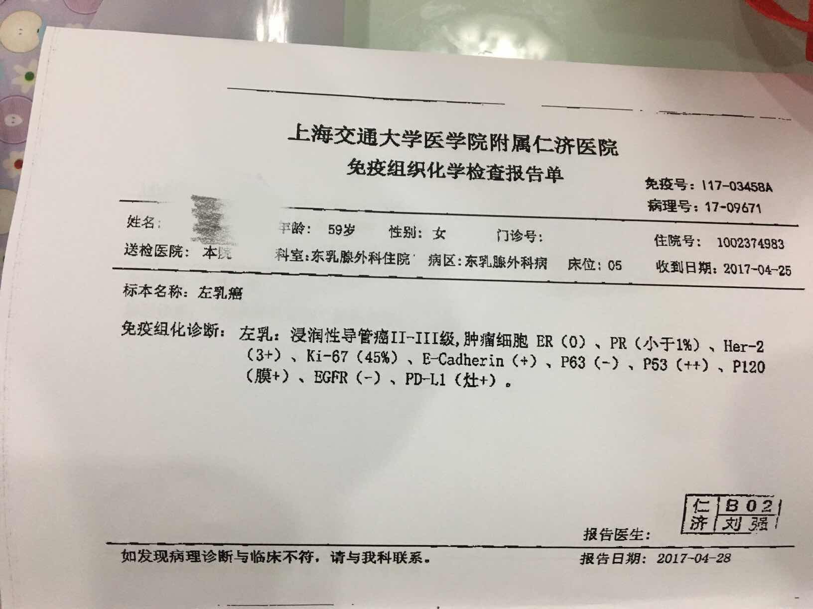 和我妈的免疫组化差不多,我妈赫已经打完了
