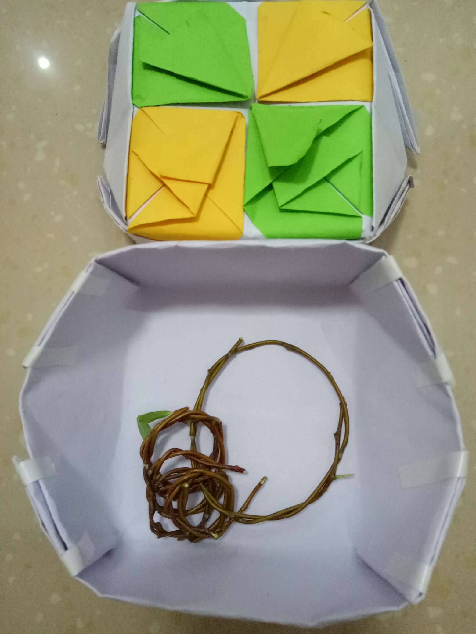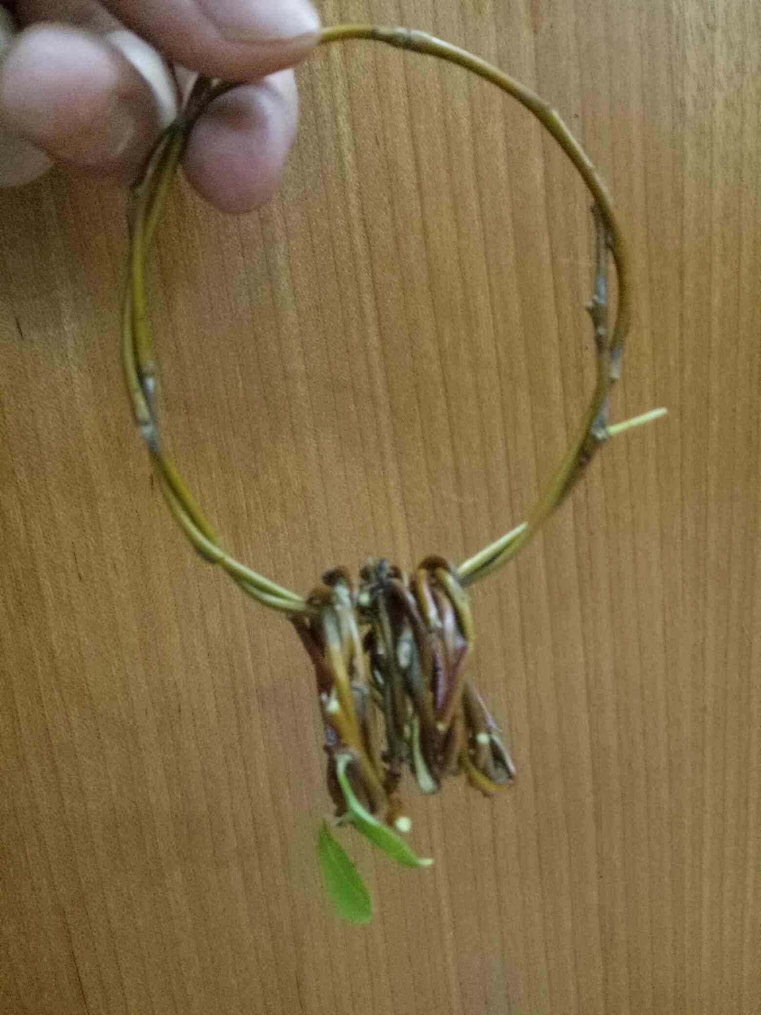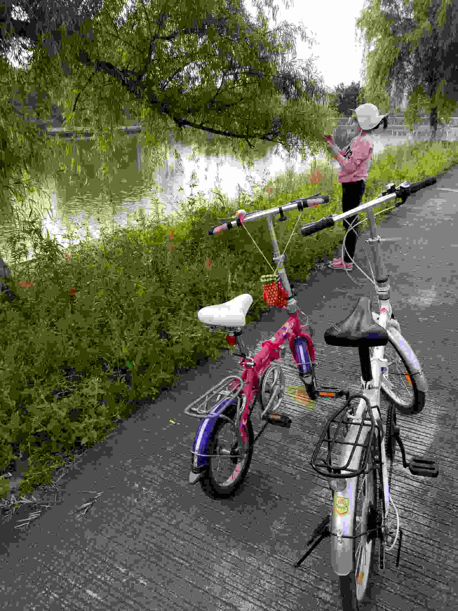 今天居然邀请我出去踩单车,我们的小红小白重出江湖啦!只踩了一公里左右,池塘边杨柳依依,妩媚身姿留住了小姑娘的脚步。她停车摘了几根枝条。临睡前给我看她要送老师的礼物,小手真巧,用柳枝编了手镯,还折了配套的盒子,我羡慕了呵!