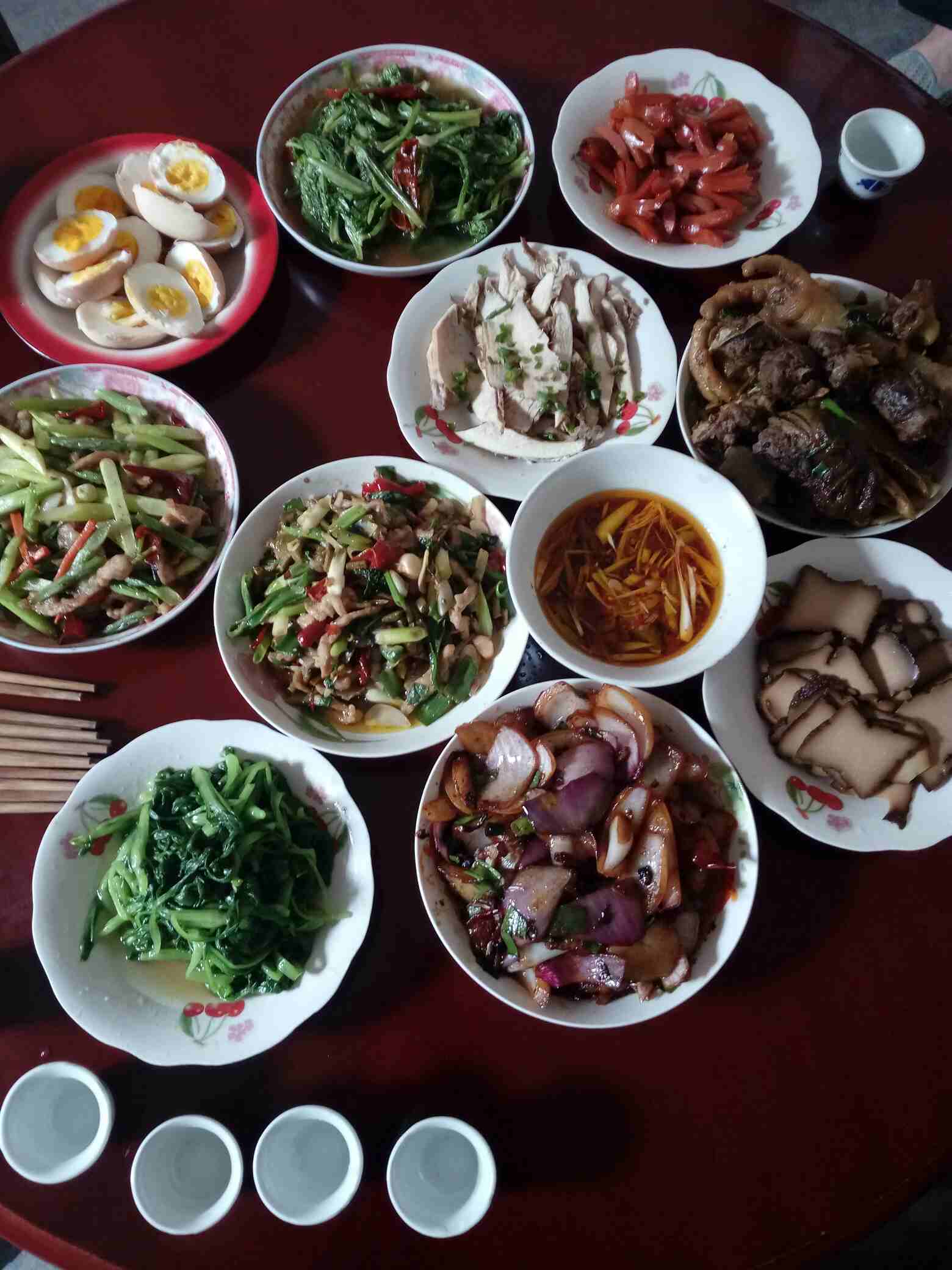 都是农家菜,青菜自己种的,大公鸡(爪)都是自家养的,豆腐干是妈妈的手,熏干的,真希望一辈都能吃上纯天然无污染的绿色食品