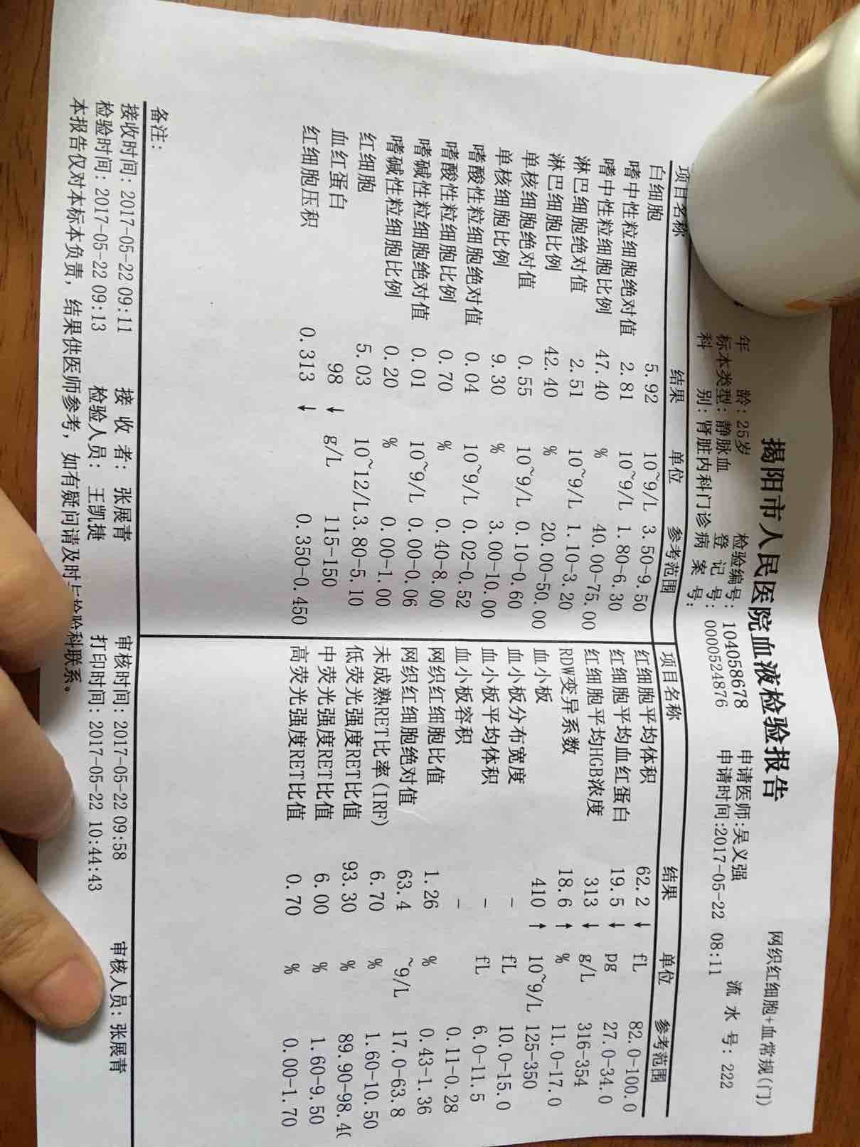 ,主任说争取下个月尿常规恢复阴性,然后就给我减环孢素,肝功能,肾功能也正常,就是还是贫血厉害,主任给加了叶酸片跟甲钴胺片,其他的一切照旧,哗啦啦地又少了几千块大洋,疼肉