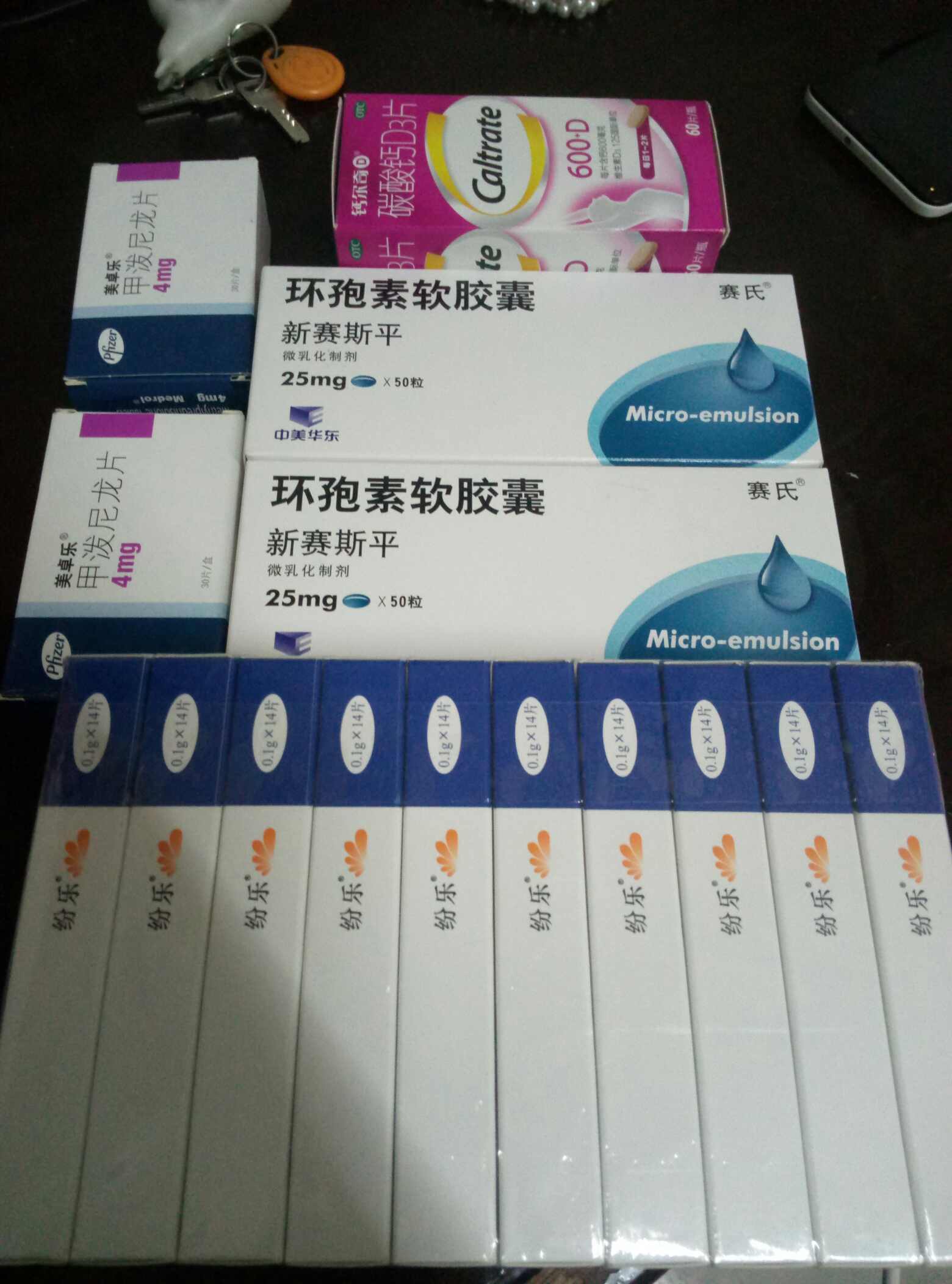 今天老爸从家里给我买的药寄过来了,一个月去县城拿一次,这次我不在家所以老爸拿着我的身份证和合作医疗证复印件帮我去拿了,因为这次医生帮我加了新赛斯平我怕家里寄过来要耽误好几天所以就先在医院买了一盒,花了259。然后我打电话回老家指定的医院看有没有这种药他们说有我问多少钱,她们说184,我有点不相信因为这和北京买的也查太多了点,一盒药就差80块钱!!我以为牌子药厂不一样呢,就再一次问是不是叫新赛斯平是不是杭州中美华东的?她们说是,好吧,今天看了寄过来的药果然一模一样!这样的话两盒新赛斯平,10盒纷乐,2盒小美,2大盒钙尔奇一共花了884因为我们那里慢性病报销最高限额一个月500所以这次给报销了500块,所以实际一共花了384块钱,好吧这个程度我还能接受!这么贵的药我一定要好好吃,希望蛋白早点稳定减药,也可以备孕要宝宝。