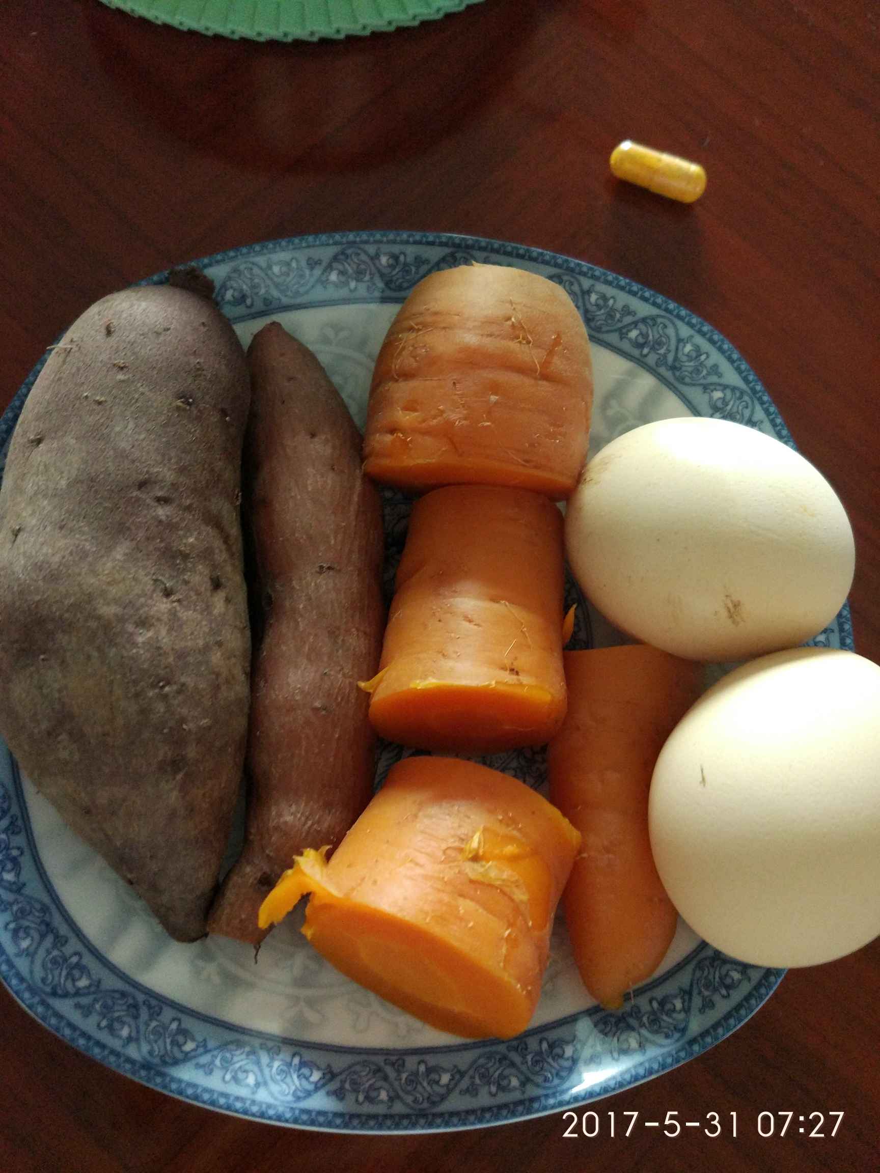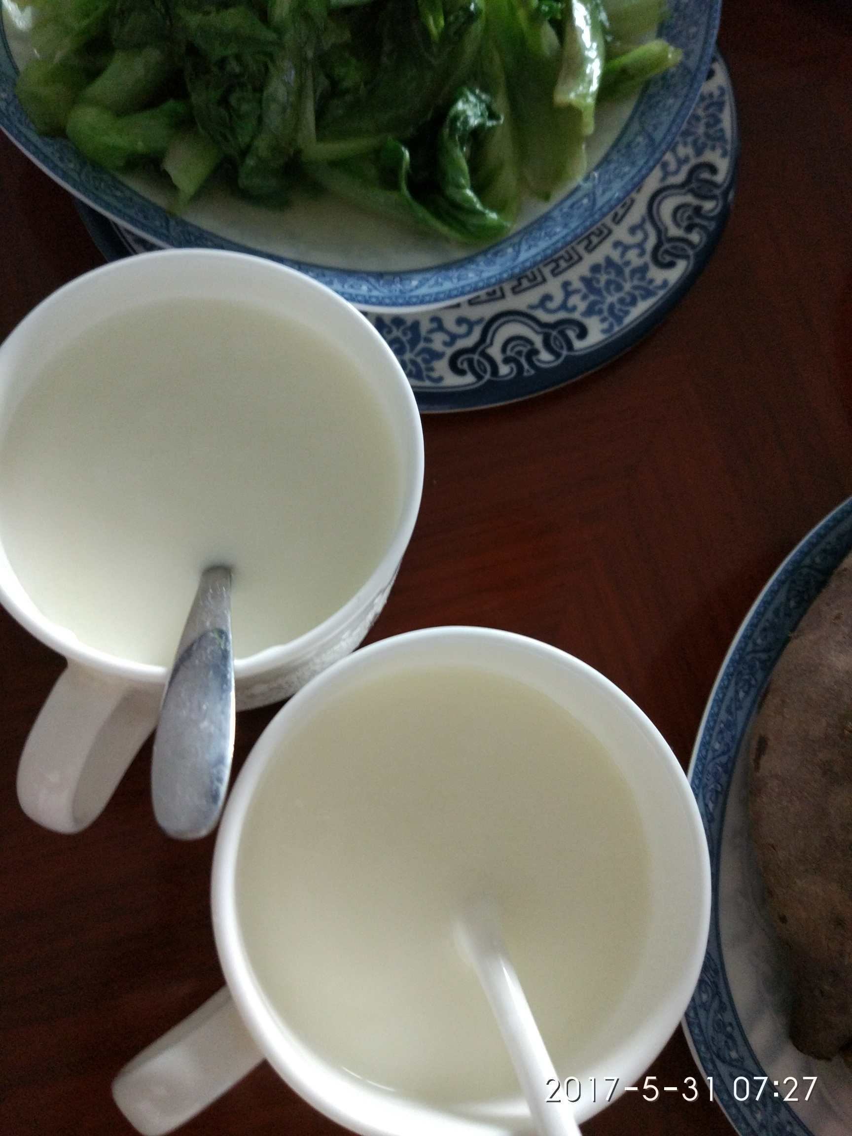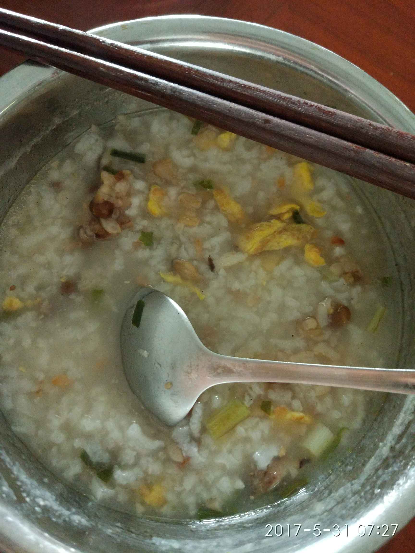 没有污染的青菜(朋友家菜园),炒腌菜(下饭菜避免太清淡),红薯胡萝卜鸡蛋,昨晚的剩饭熬粥。还有一个是重点介绍的家乡夏季必备食品:米茶,从小吃它,大爱,特点解暑,吃着香,以前都是自己家做,现在已经产业化了,有专卖的,买回家自己煮就行了,做法:用普通大米(不带糯性的)炒至焦黄,冷却后装好(密封保留香味),需要吃时用开水煮至炒米开花即可,注意一定要多放水少放米,应该比稀饭的水还要多些,随时吃,我们一般是早晨煮一锅,中午晚上都吃,不易坏的