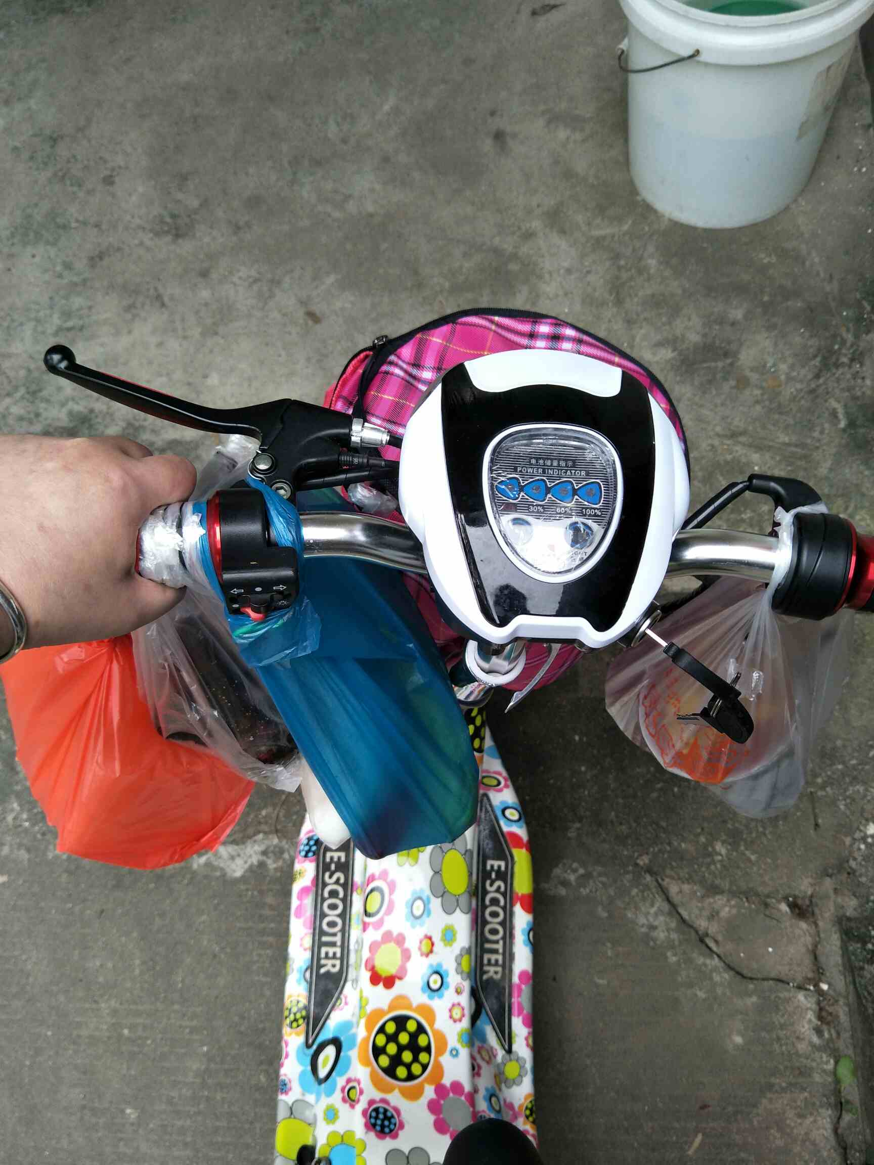 买了虾,猪肉,腱子肉,苦瓜,大白菜,一个红椒,一条排骨,6块钱马蹄2块钱海带丝,2块钱木耳,3块钱饺子皮,3块钱猪肠粉就这些啦!车篮满了,还要挂车头,幸好买了小花,幸好有小花,我才这么潇洒,不用走的累扒!