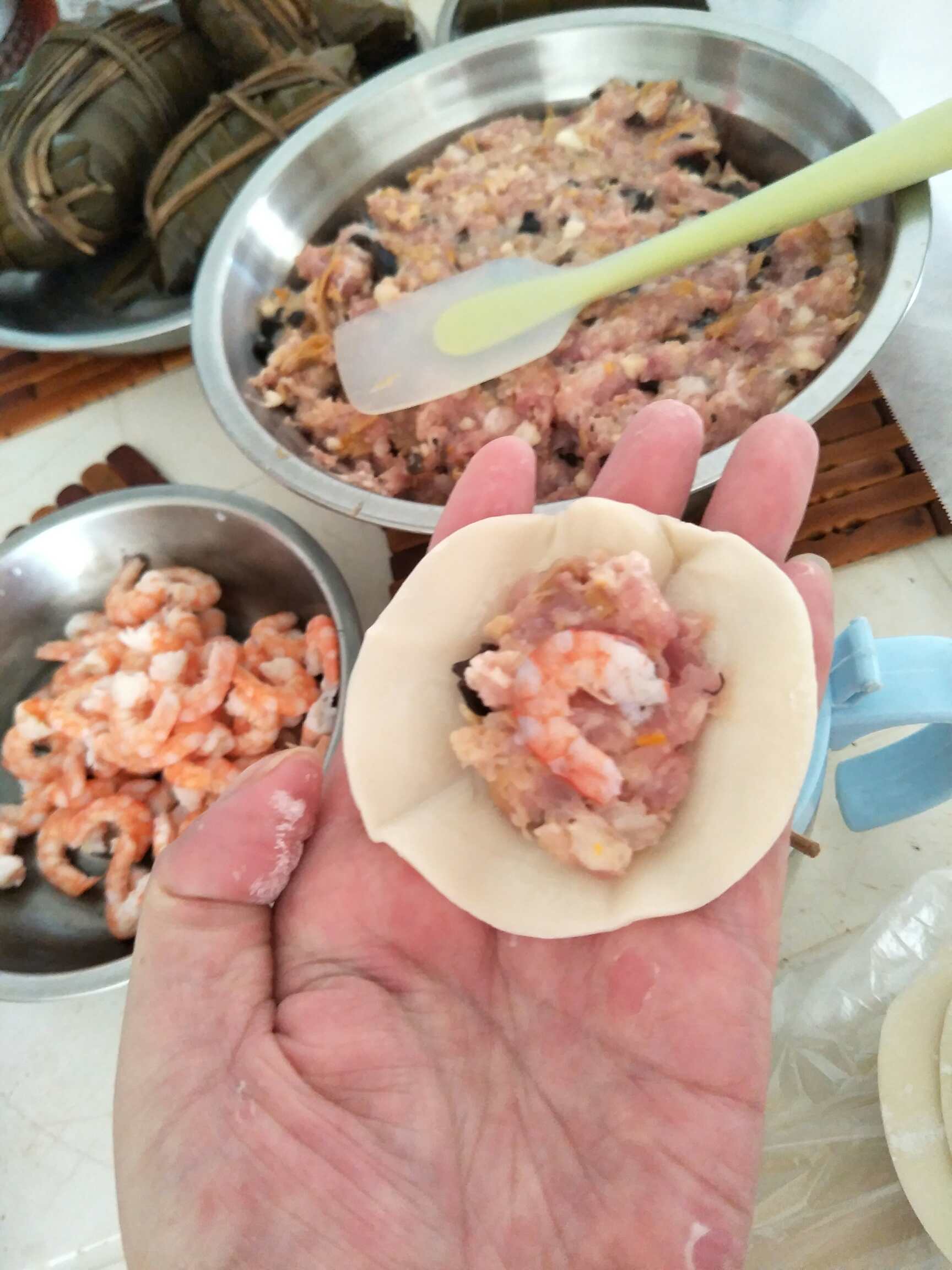 接下来,我接到妹妹的电话,她回来吃饭,好吧,我包虾饺你吃呗!我纳闷了一会,用大白菜包,还是玉米呢?算了,用黄花菜,木耳,马蹄(荸荠),猪肉,鲜虾肉,剁成肉饼,调个味,开始包,本来想用一点点的,谁知道剩了好多虾,我煮熟了,剥了一个个的,在包的过程中,一个饺子放一个虾,哈哈,包的跟结实,皮挺好的,啖啖肉啊,最后馅料剩下一些,还得买点皮包起来,昨天包的大约四十多个吧,今天就给搞定了,😄😄妈妈刚回到家,尝了几个,真心不错,不能吃韭菜的,可以这样选择,可以不放虾,多放些木耳,我的也没全部放下去哦!