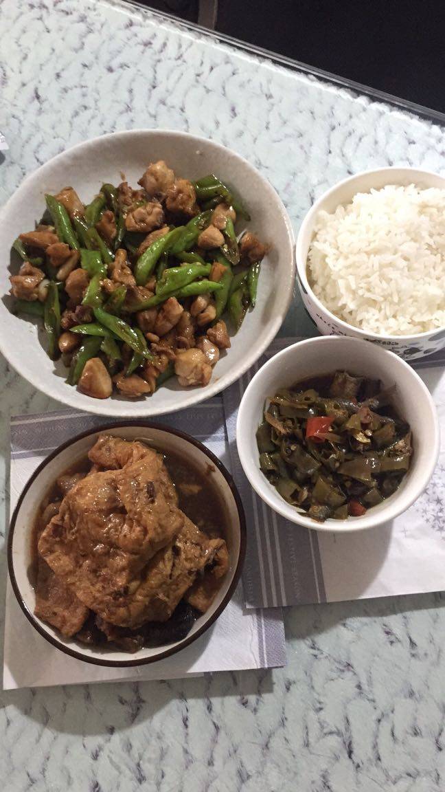 然后就一个人炒了个菜,焖了米饭,前一天炖的油豆腐和鱼干热了下,吃得心满意足