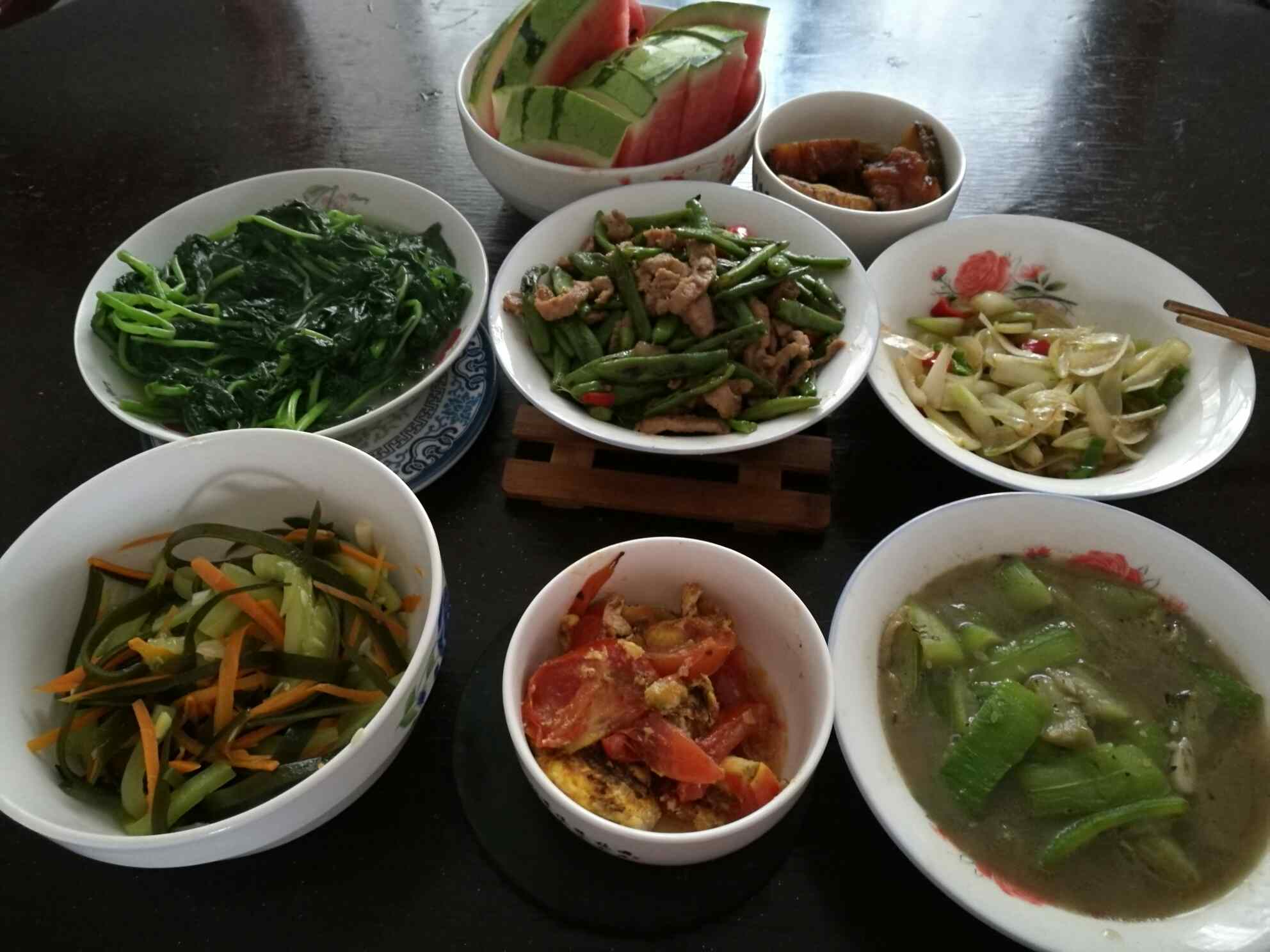 妈妈做的晚餐,各种蔬菜美味可口。生病后戒了红肉,以鱼和蔬菜为主,辛苦爸妈和老公每天为我的饮食操心。