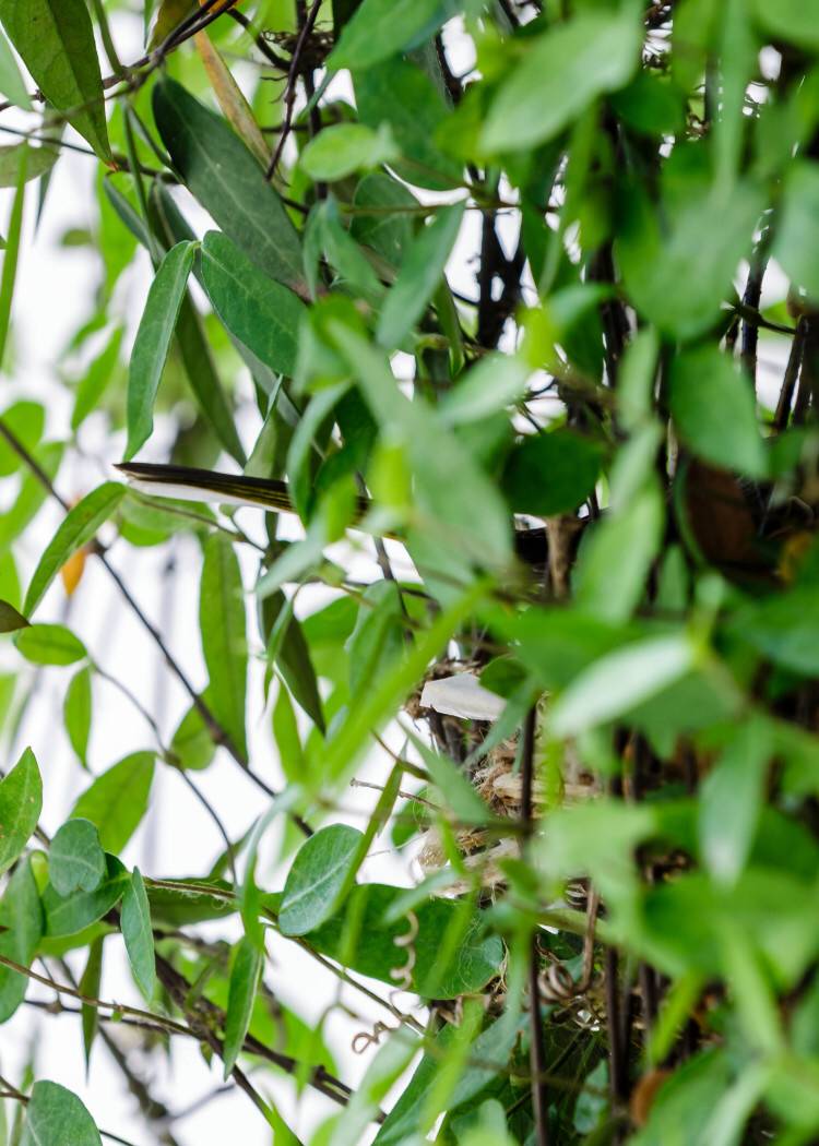 一对鸟夫妻(白头翁)在我花园络石藤里筑巢,养儿育女忙不停,真够拼的。