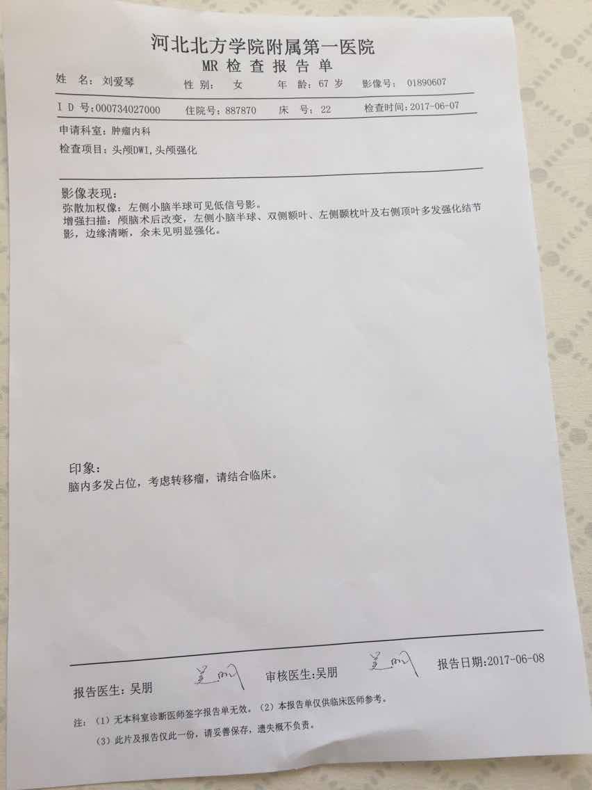 转眼间,已经化疗7次又单药安维汀使用了4次后,癌细胞已经无法控制住,绝望的气息又一次猛烈的袭来,医生让我们试了两个月的凯美纳,复查结果无效。此时的我又一次万念俱灰,又做了一次基因检测,结果还是都没有突变,只好吃了9291,一个月后复查,颈部淋巴减小,胸水,心包积液几乎没有了,我又一次哭了,感谢老天能多给点时间,我不知道再一次的绝望何时到来,希望越慢越好。