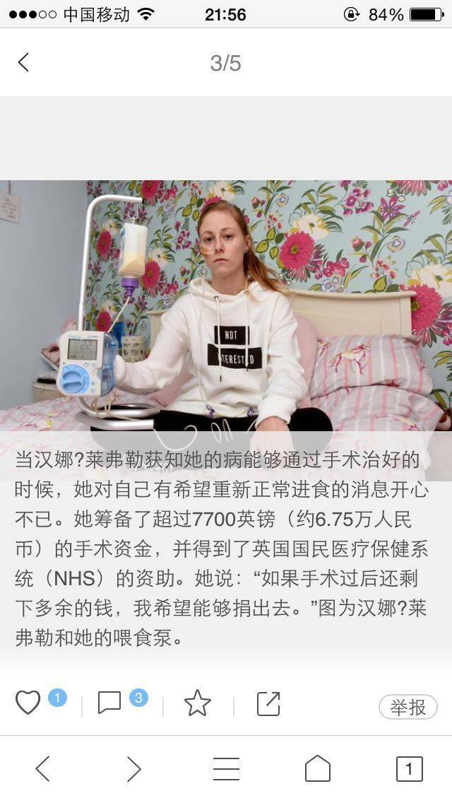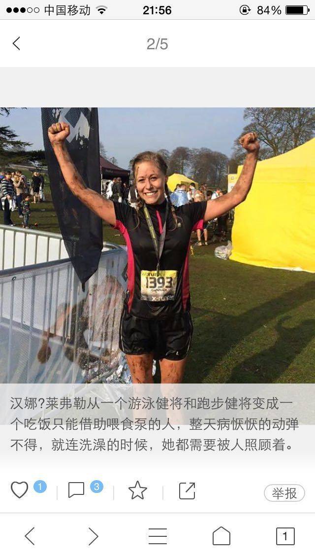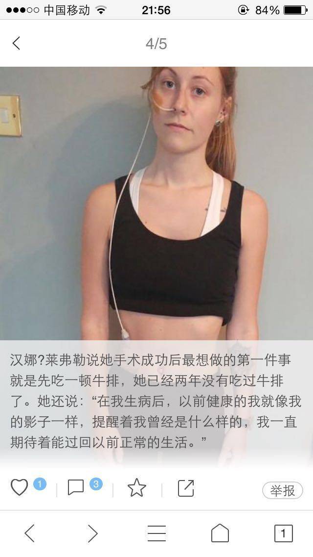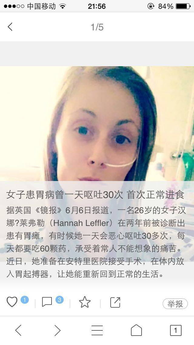下面的图片就是我对面老板娘看新闻看到的,她说外国的一个女的和我一样插着管子,也是年轻一样胃瘫,而且她曾经还是一名运动员。胃瘫两年了,也是吃不了东西,那个痛苦,只有我懂她了,因为我感同身受了😭😭😭