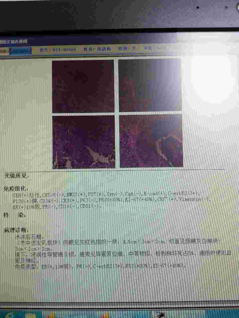有很多看不清楚,能看清的部分有几个想法,1、er有10%,不要放弃内分泌治疗,建议听听医生意见,有的医生认为5%的内分泌治疗都有好效果的,ki67有40%,相对活跃,不能放弃任何希望;2、分级是2级,比较早,要坚持规范治疗:3、淋巴无转移,预后会好。希望你妈妈能接受规范治疗,不要放弃任何治疗方法,早日康复!