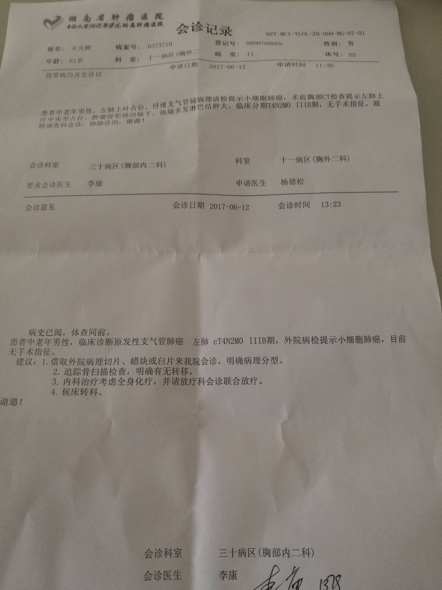 6月1日,我爸(61岁)被诊断出肺癌小细胞癌,目前在湖南省肿瘤医院,明天将完成最后一个检查骨扫描。检查后医生会给出治疗方案。好害怕好绝望,不知道该怎么办?我爸单薄偏瘦,放化疗他能承受吗?很多人建议保守治疗,可是我不敢选择,我怕万一选错了耽误了怎么办?求求大家给一点建议!