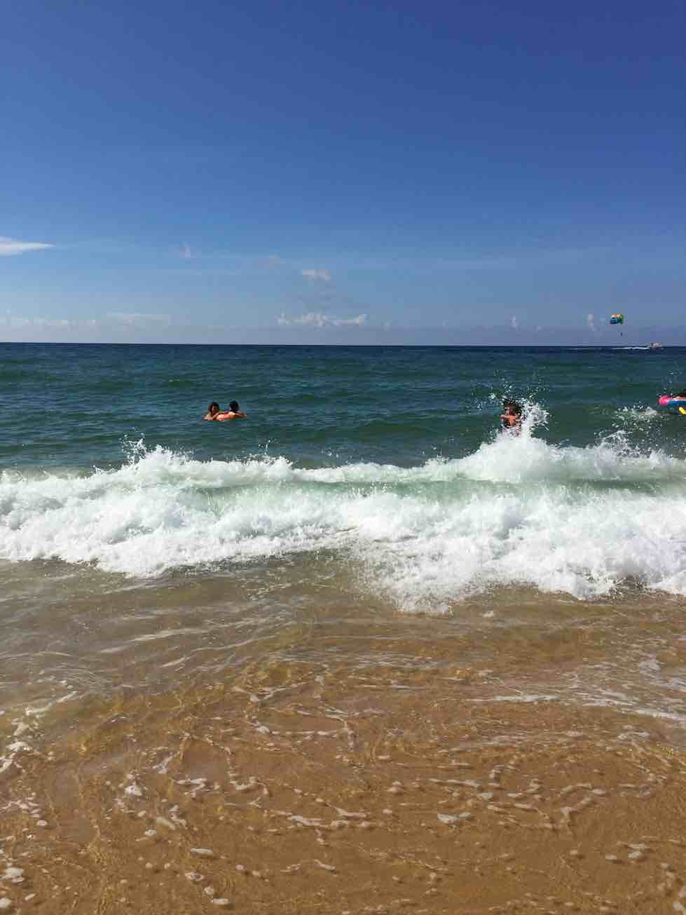 ,不能晒太阳,一直到傍晚四五点才开始下的海,这边的海还不错,沙子比较细,海水很干净!浪比较大,不适合游泳,带上游泳圈在海边冲浪,很好玩,小孩也很高兴!