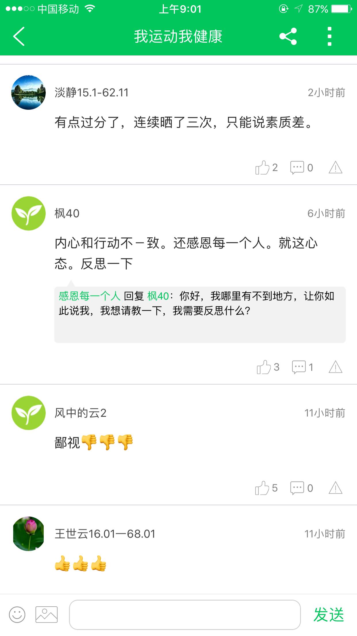 我想我们在此绝大多数人都是喜欢这个平台的,否则也不会经常上来。对平台提出一些建议甚至意见,出发点也是出于爱。近期平台新推出了一种功能叫分享步数,初衷是希望分享帮助我们爱上运动,并坚持走路,用意是好的。有一部分人非常反感觉得覆盖了真正想看的内容,继而将这种不满发泄到分享的个人身上。这是不对的,分享的个人响应了平台号召,她们没有错。如果平台没有这个功能,没有大力推广,个人又如何使用,如何分享,如何所谓的干扰到大家?现根本性地解决是呼吁平台能增加程序开发,如新功能或新插件,让两类人群彼此不矛盾,各自想看到各自的内容。不要将矛头指向个人,她们也是使用者,这项功能测试某种程度的受害者。我爱觅健,让我们彼此多一份包容。