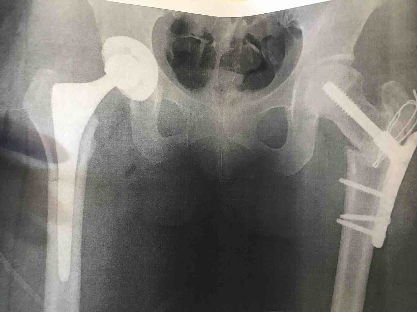 股骨头手术后第3天,昨天还疼的完全动不了,今天已经可以下床坐轮椅了。给大家附上一张检查结果,左边(这就是我们肉眼看到的右边,有缠着固定板的)是一月份动的骨移植手术,股骨头没有坍塌的情况下,骨移植是一个很好的选择,就是到恢复完全时间花的比较长,然后有负重限制,最初2个月只能负荷10公斤的体重,最后一个月才加到20公斤。右边股骨头置换手术是前两天做的,疼痛已经减少了很多。顺利的话10到14天就可以出院了。