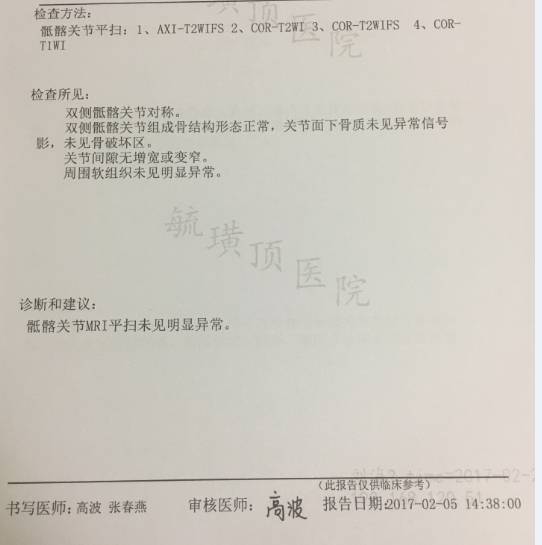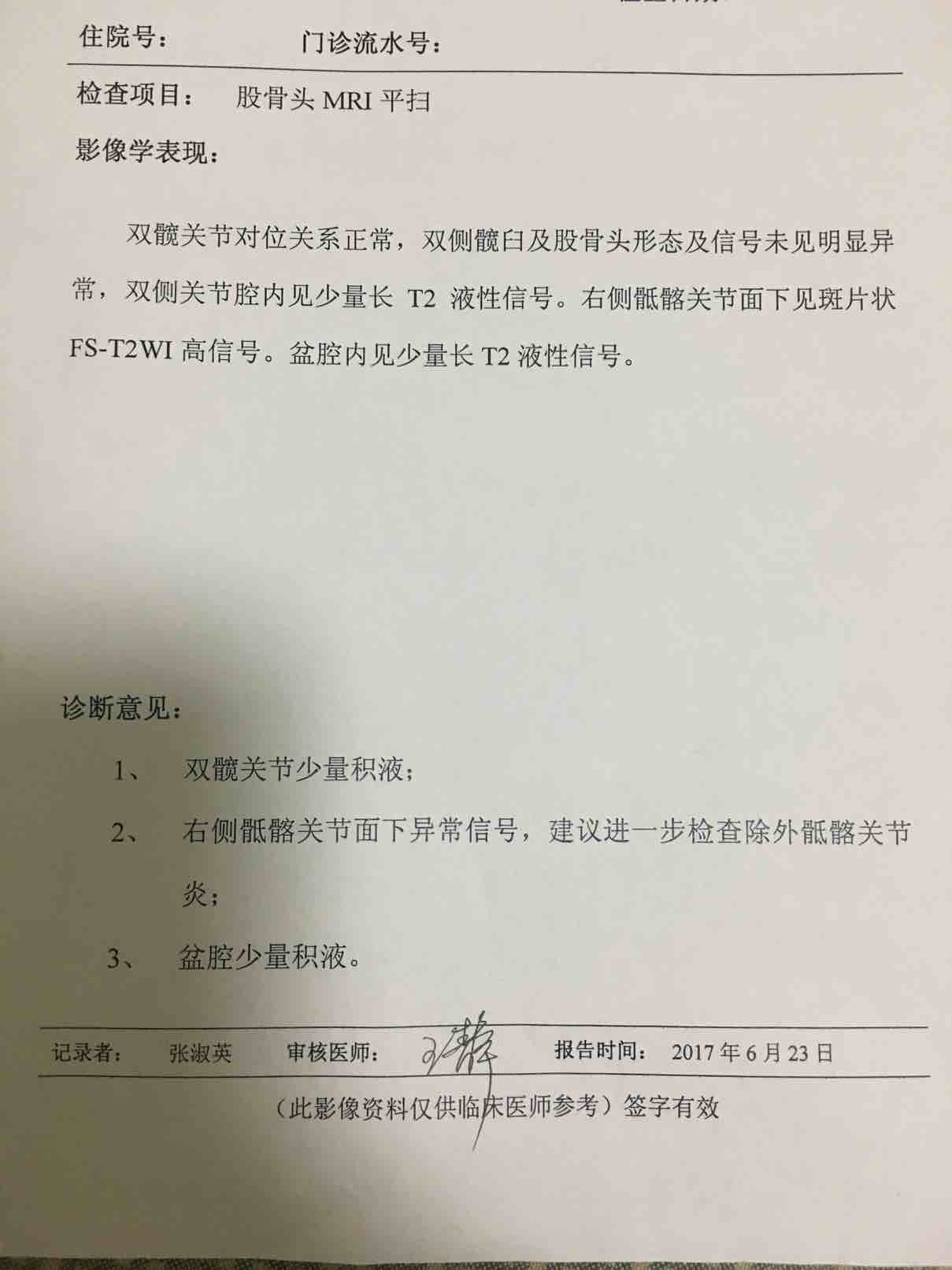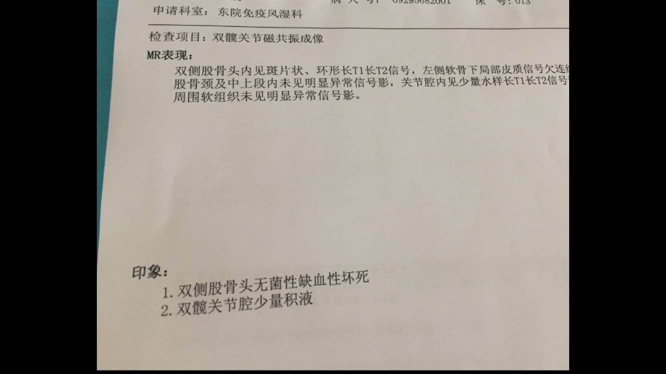 2月份确诊狼疮,当时住院做的骶髂关节平扫一切正常。但大约一个月前,先是右侧后面大腿根处异样,后来是左侧前面大腿根处有痛感,接下来是膝盖坐久了站起来疼,下蹲时也稍有疼感。虽然都不是疼的厉害,但看了大家骨坏的描述,还是很担忧!所以今天上午去做了股骨头平扫,结果显示有积液,大夫说不是很严重,会自行吸收,要注意休息。一颗石头落地。