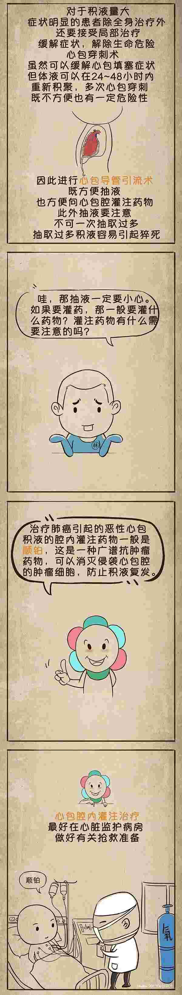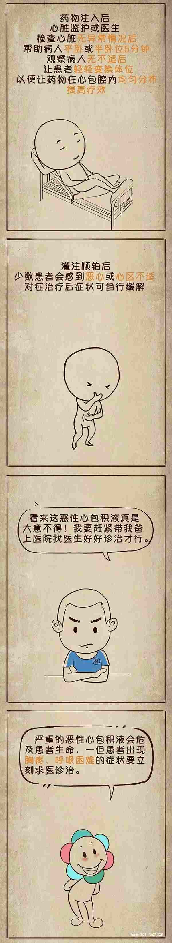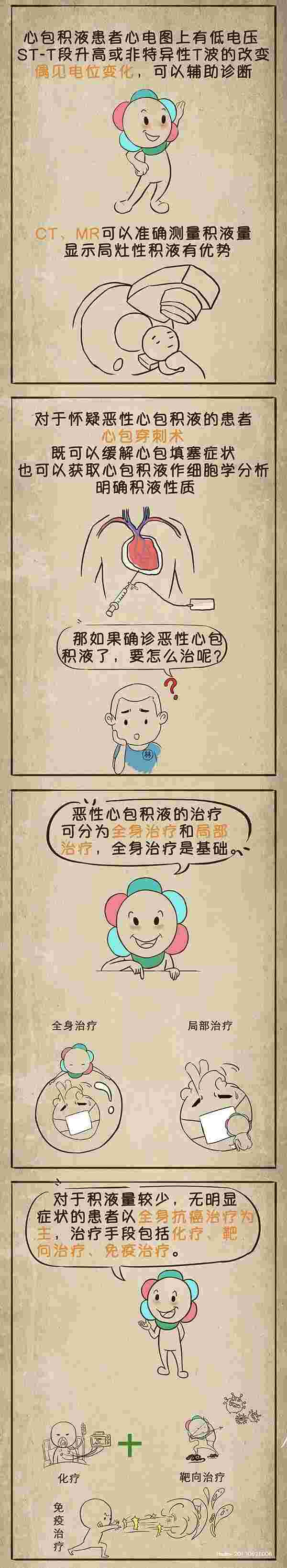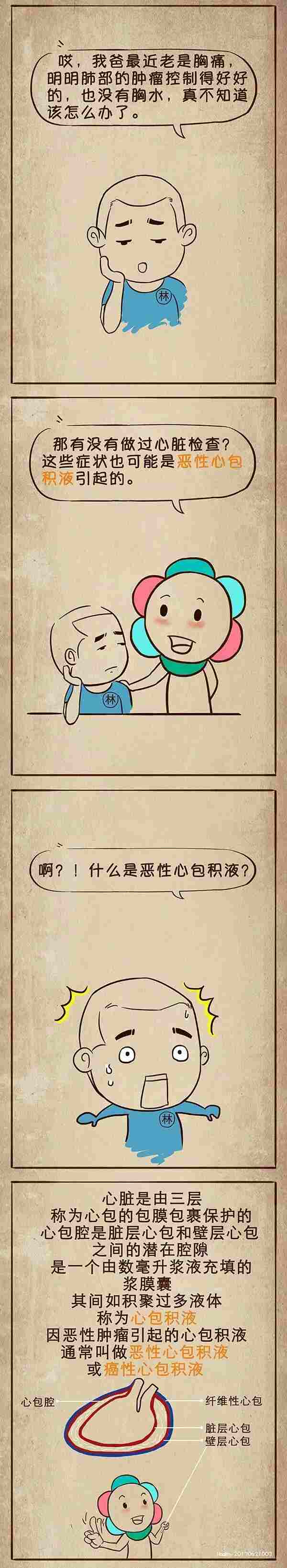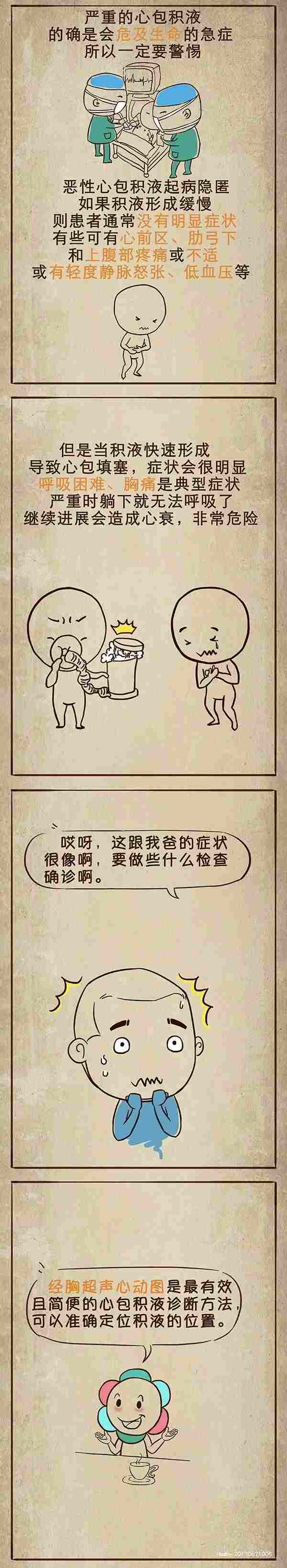 我家爱人当时就是恶性心包积液,整个心脏在B超下看被挤的变形了,人也很难受,喘不过气来,睡不下去,只能躺着,到医院把心包积液抽出后人开始舒服一些,拿去化验是恶性的,有癌细胞在内,后面灌注药物进去后才控制住了,现在挺好的。所以大家一定要引起注意,感觉有上面这些症状一定要去做B超检查一下,都说有些人真正的不是癌症死亡而是死于其他并发症。