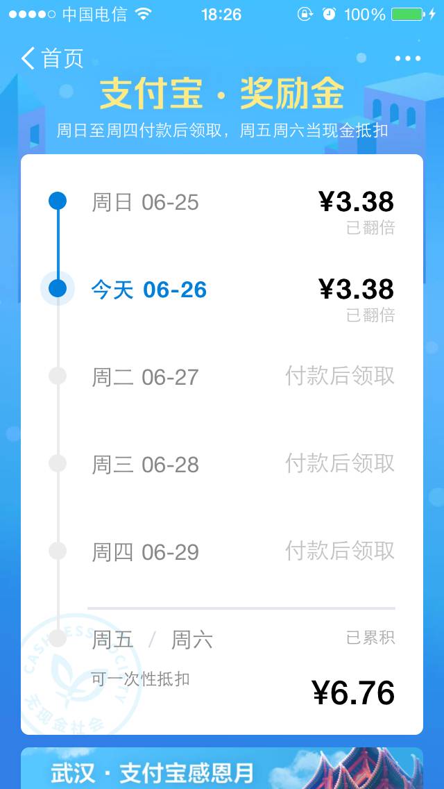 支付宝武汉感恩月活动,每天买东西用支付宝支付,周日—周四付款后领取奖励金,使用花呗奖励金可翻倍。周五/周六一次性抵扣,武汉的姐妹可要抓住机会哟。