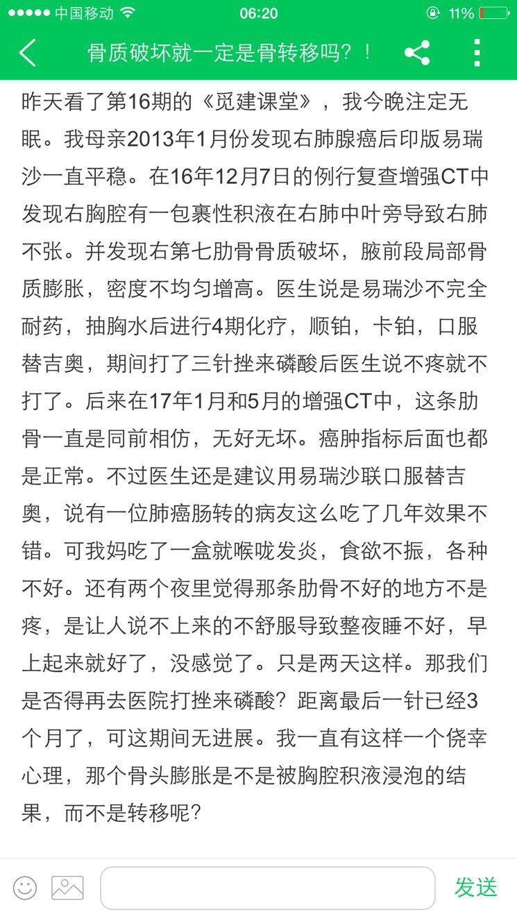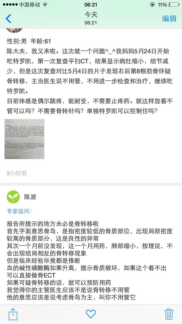 感觉陈医生说的另一位论坛发帖的觅友,应该就是我。没有选择去做骨ECT一是因为爸爸现在无法脱氧,下床最多能走三四分钟,当地县医院没有设备,如果做就要坐救护车跑到邻市,怕现在太折腾他,关键还有即使骨转,因为之前的严重放射性肺炎,估计局部放疗没法再做了。
