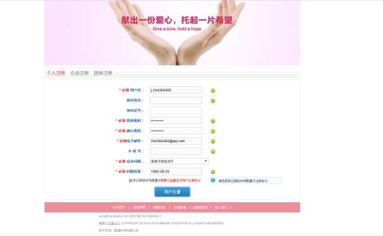 2、点击右上角的注册的按钮,成为爱慕公益基金的会员,进入注册,填写相应信息: