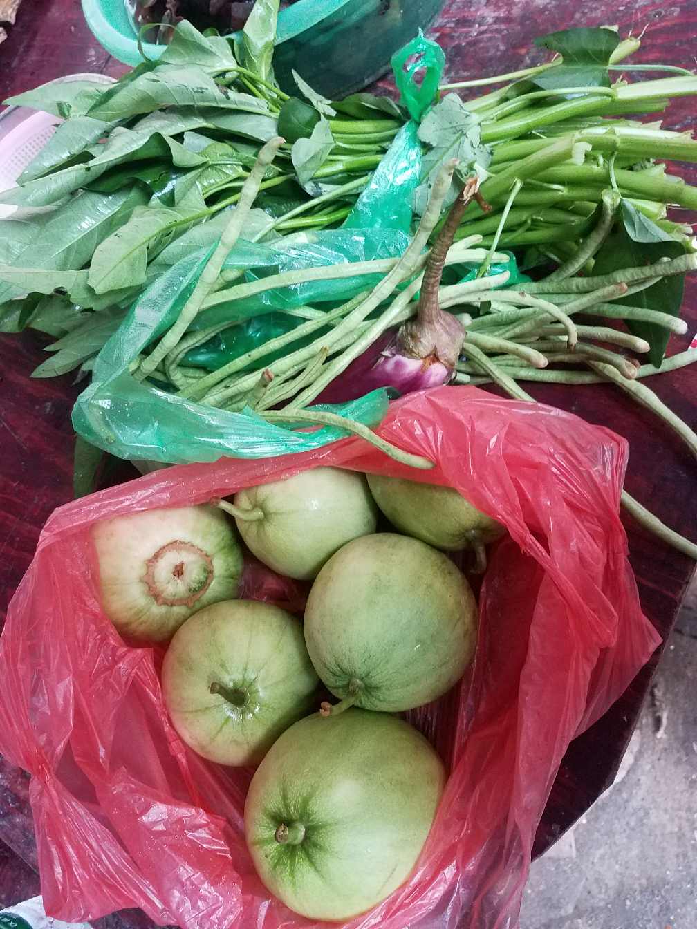 今天我在他那买了茄子和豆角,还有空心菜,全是一块钱一斤,那香瓜他说也是一块一斤,下雨天的,他说便宜卖了算了。我看到便宜,又忍不住买了,还买了6个😄😄香瓜加上茄子,豆角,空心菜一起,一共他才收了我6.5块钱,便宜吧😁😁😁