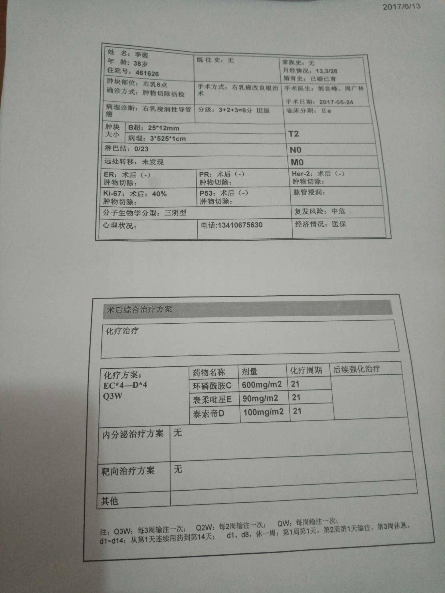 我用的也是这个,效果很好,不过我是tac,三种化疗药一起用,6个疗程,病理完全缓解!