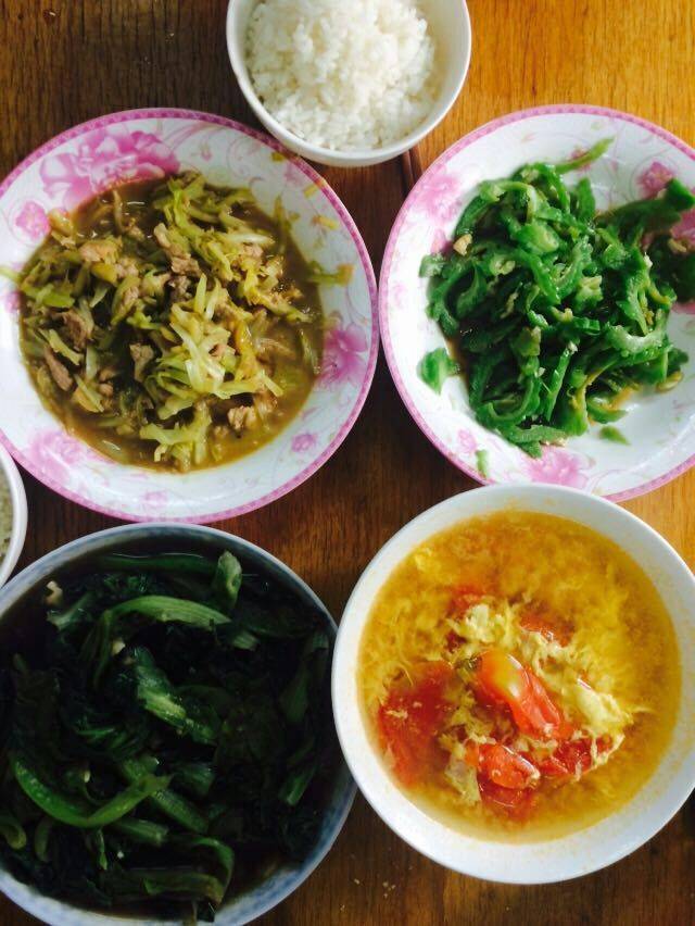 今天午饭,嘻嘻,吃的好饱,蒜黄肉丝,凉拌苦瓜,生菜,西红柿蛋汤~