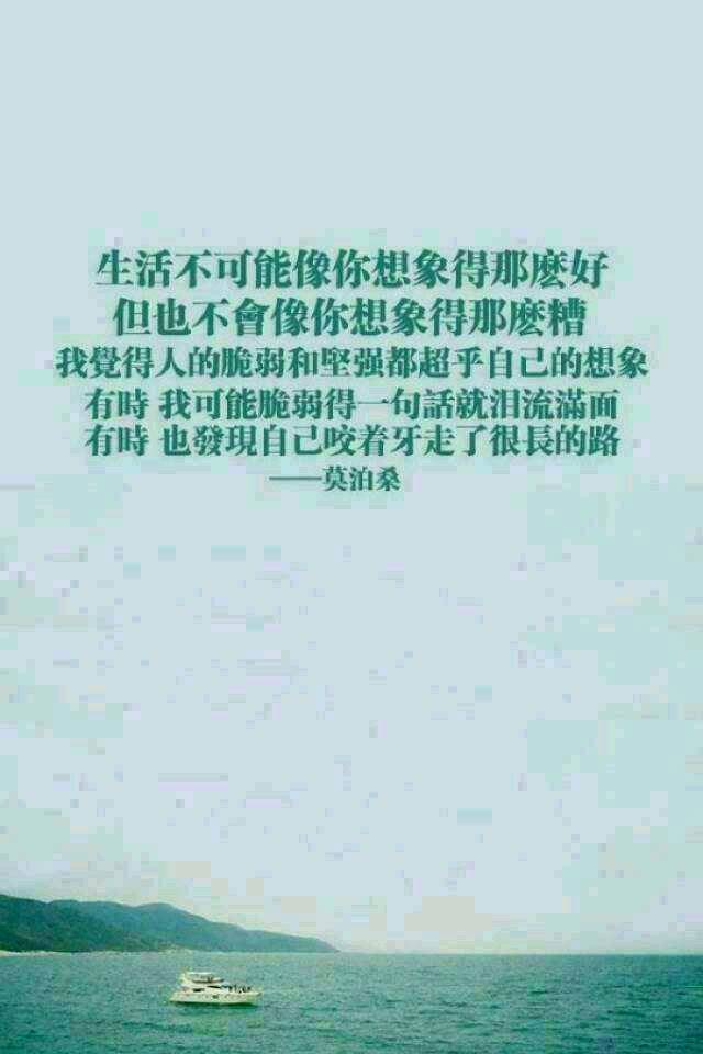 很喜欢法国作家莫泊桑的一句名言,与姐妹们共勉:生活不可能像你想象得那么好,但也不会像你想象得那么糟.我觉得人的脆弱和坚强都超乎自己的想象.有时,我可能脆弱得一句话就泪流满面,有时,也发现自己咬着牙走了很长的路.