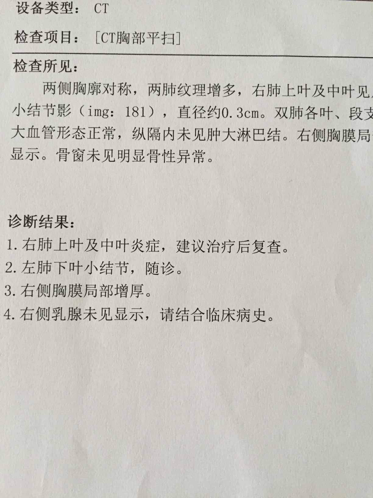 在今年6月21日是我赫赛汀最后一次用药,计划在靶向治疗结束一定认认真真选择一家好点医院查查我滴滴答答一年左右的咳嗽,昨天拿到报告看诊断结果:心情立刻不美丽了!显示炎症可以忽略,显示小结节有点让我胡思乱想了!甚至于昨夜失眠,整个人感觉不舒服!今天一早就拿着以前和新的报告去了医院就诊一周前就预约的主任,主任看了新旧报告及询问一些情况,仔细听了一下我的前后胸,跟我说没什么大碍,开点药回去吃吧!半个月不见效再来检查,我追问起来,这个小结节也没有事吗?主任说:没事的!本来一直沉重的心情突然又开朗起来,顿觉浑身舒服了!唉~看来我的内心还是不够强大啊!发表此说说想表达我的两个观点:1.希望所有的姐妹在拿到检查报告显示有小结节的不要根据自己的判断给吓唬了;2.心态真的特别重要,为什么我心情沉重的时候感觉到就像病入膏肓的状态,当心情明朗时我又开始生龙活虎了!