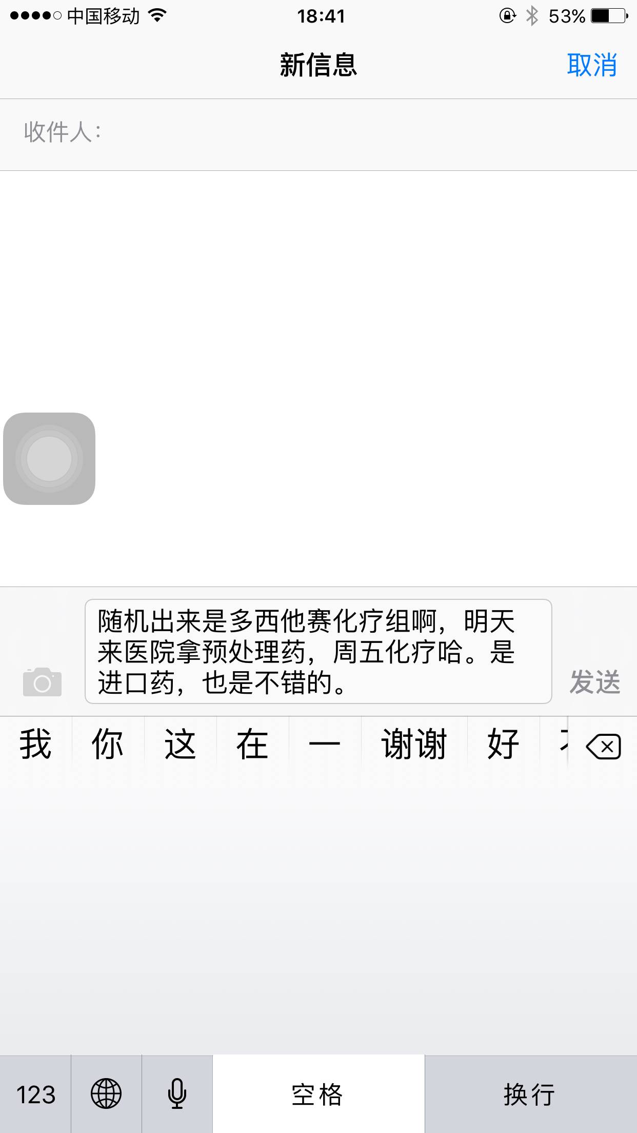 今天主治医生给我发短信,又把我的心情低落到底谷了,本想或许可能能进入PD1组,信心满满的,却又被当头一棒,还是被选入化疗组多西他赛单药化疗,这机枸也是二百伍,他们随机也不看以前的治疗方案,既然符合PD1,为何又要盲选,我们已经化疗6次了,单药贝伐也3次了,已化9次了,还要再继续化疗,真不知道他身体是否能承受的住,反正我们的运气也是够背的,老天真不开眼,这一个月的时间总在煎熬和期盼中度过,从不迷信啥的我也跟着婆婆拜佛供佛事,企盼这一次能入组,上个星期告诉我们说我们已入组了,那心情激动的无法形容,可又告诉我们说还是要随机筛选入哪组,我的心每天都在企盼希望能入PD1组,今天傍晚医生的短信又让我崩溃了,上帝己经够不怜悯他了,却也不给他一点希望,拖了一个月上星期五做增强CT,今天医生说两边肺上又新增小结节了,可能真的被耽误了,该怎么办呀,这癌细胞真的不给人一点喘息的机会,真的要拼个两败具伤它才放手吗,那就来吧,我们奉赔到底了,只要我们不死你也不要想有好活头,用药干死你。老公心态比我好,我刚看到短信就打电话给主治医生,她告诉我实情后又忍不住跑到厕所里去大哭了一场,老公还安慰我说没事的,我们配合治疗,我知道他是男人有泪也不敢流,只能闷在心里,真不知道怎么安慰他,只能告诉他只能自己坚强起来才能和小癌作斗争了。现在只能先用多西他赛单药化疗了,老公自潮说现在身体还行,还可以受的了,实在不行就自己买pD1来用或者试试靶向药了。现在真的只有走一步看一步了,真希望老天能开眼,救救好人,让他能迈过这个坎….…