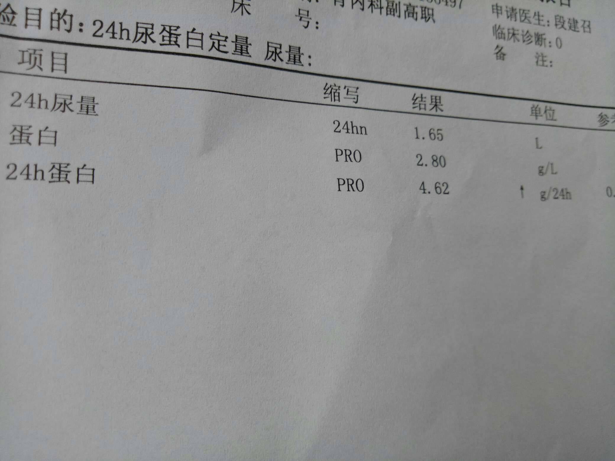 医护人员赶紧打电话叫保安,保安还没来俩人就没下文了,哈哈! 抽了血,放了尿,当然是去吃早餐了,买了一个煎饼,一杯八宝粥都吃了,坐等结果吧!等待中…………………… 一个多小时24小时定量出来了,我一看结果吓一跳,心情瞬间不好了,其实我早就知道结果肯定高,不知道为什么一说复查提前一个星期就心情不好,可能是害怕的原因吧,上次定量2点多,这次直接蹦到4.63,欲哭无泪啊,怎么会这样?难道是因为昨天吃了油腻的鸭肉么?还是最近吃的咸了,环磷酰胺我也在打,之前是从6克多降到2克多的,这次又升了,我的小心脏啊,想这么多没用,我就干脆不看了,又大概半个小时吧 第二个检查报告也出来了,好多箭头啊,我也没仔细看,只想着赶紧让医生看结果 就能开药回家了,我就找医生来了,到六楼,这个医生还是按原来的药给开的,我问激素能不能减,其实我知道他也不敢减,毕竟我不是他的病人,他说不能减,我说八颗我都吃俩月了,他说至少吃三个月,就这样又把我打发了,我就下一楼拿药喽,临走之前我又问了一遍激素能不能减一片