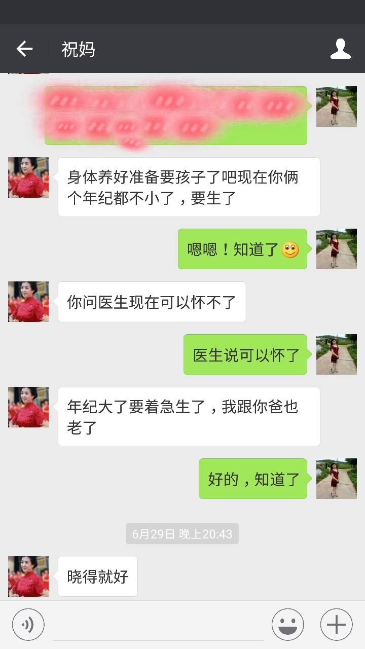 自从上个月月尾婆婆发了信息,问了我现在的身体怎么样?能不能怀孕了?我告诉她说身体挺好的,医生也说能怀孕了,她就叫我们快点要小孩子了,因为她说我和老公都不小了,他们也老了。