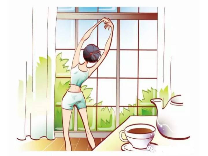 收展运动:双手向两侧展开,再向斜下,在腹前交叉,重复进行。