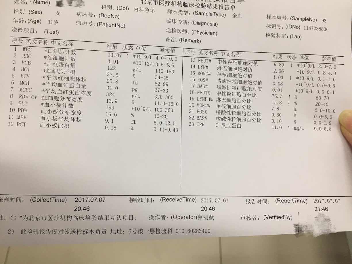前天嗓子不舒服,在家里喝了一天水,昨天感觉好了很多,之后下午去健身了,到家之后整个人都不好了,浑身无力,头晕,一量体温38度了,赶紧去医院,验血,生怕血小板下降,还好结果还不错,只是细菌感染,医生开了消炎药和止咳糖浆,我特意咨询了医生,消炎药没关系,不会使血小板下降,可是退烧药会使血小板下降,病友们要注意,千万别自己吃退烧药呀!
