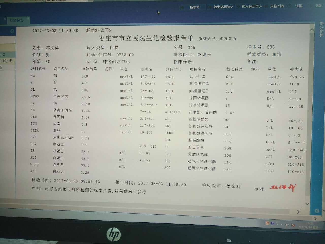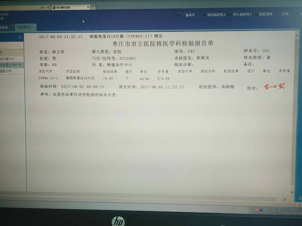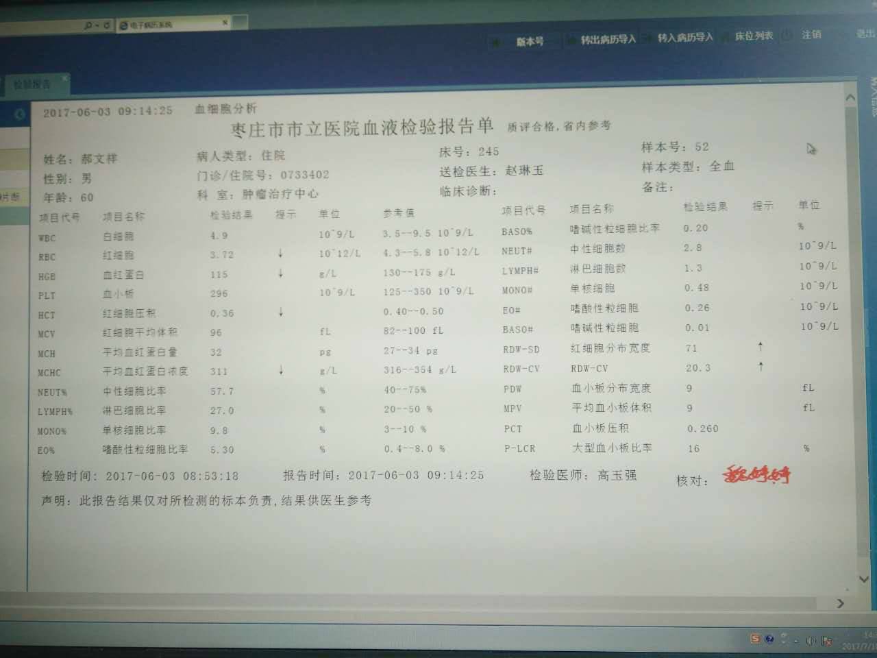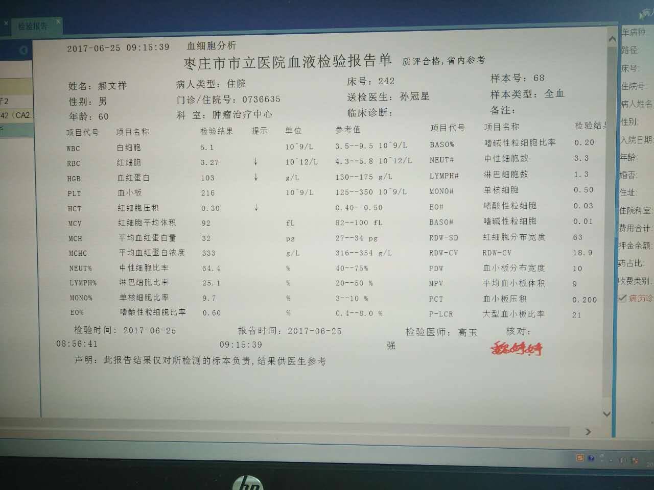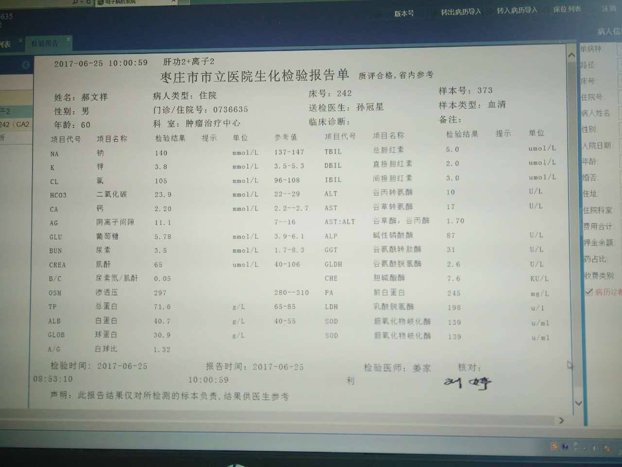 我看说是肿瘤科,病人本身有没有确诊什么情况呢?