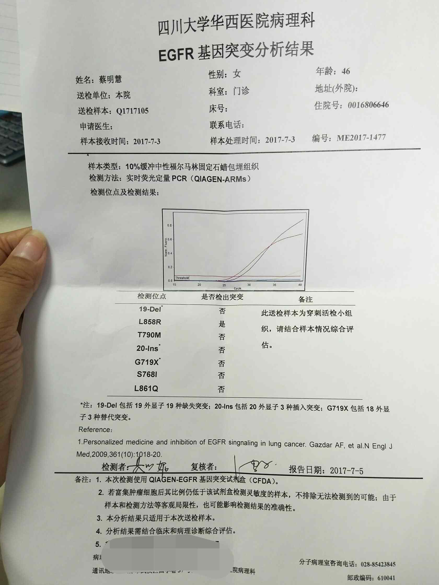 妈妈肺癌脑转移,现在病情恶化,肿瘤长得好快,一年前查出是肺腺癌,盲吃特罗凯后很有效果,肿瘤缩小,头部肿瘤也没有了,吃过5个月的靶向药特罗凯,后来越来越瘦,肿瘤越来越大,现在查出来是肺鳞癌,我还是给她做了个基因检测,结果如下图,懊恼的是我问了三个医生这个结果就有三种不同说法,有说吃阿法替尼的,有说从新检查一下t790m的,或者盲吃9291,还有的说不敏感吃什么都不是很有效果的,妈妈现在情况越来越糟,请看得懂的帮忙看看,给出你宝贵的建议,万分感谢!