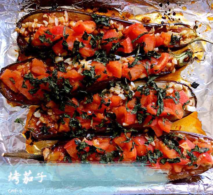 茄子和番茄整颗到微波炉叮五分钟,然后晾凉后茄子中间剖开,番茄去皮切丁,蒜切末,紫苏切末备用,调一个酱汁:酱油,糖,韩式辣酱,泡菜汁,香油;茄子平铺烤盘上,依次放酱汁,蒜末,番茄丁,紫苏,最后放烤箱200度10分钟。