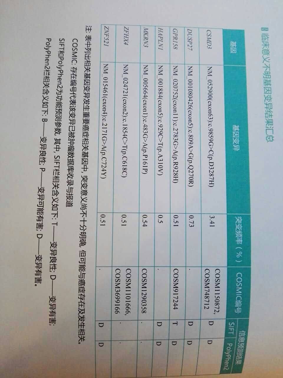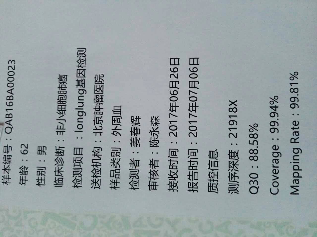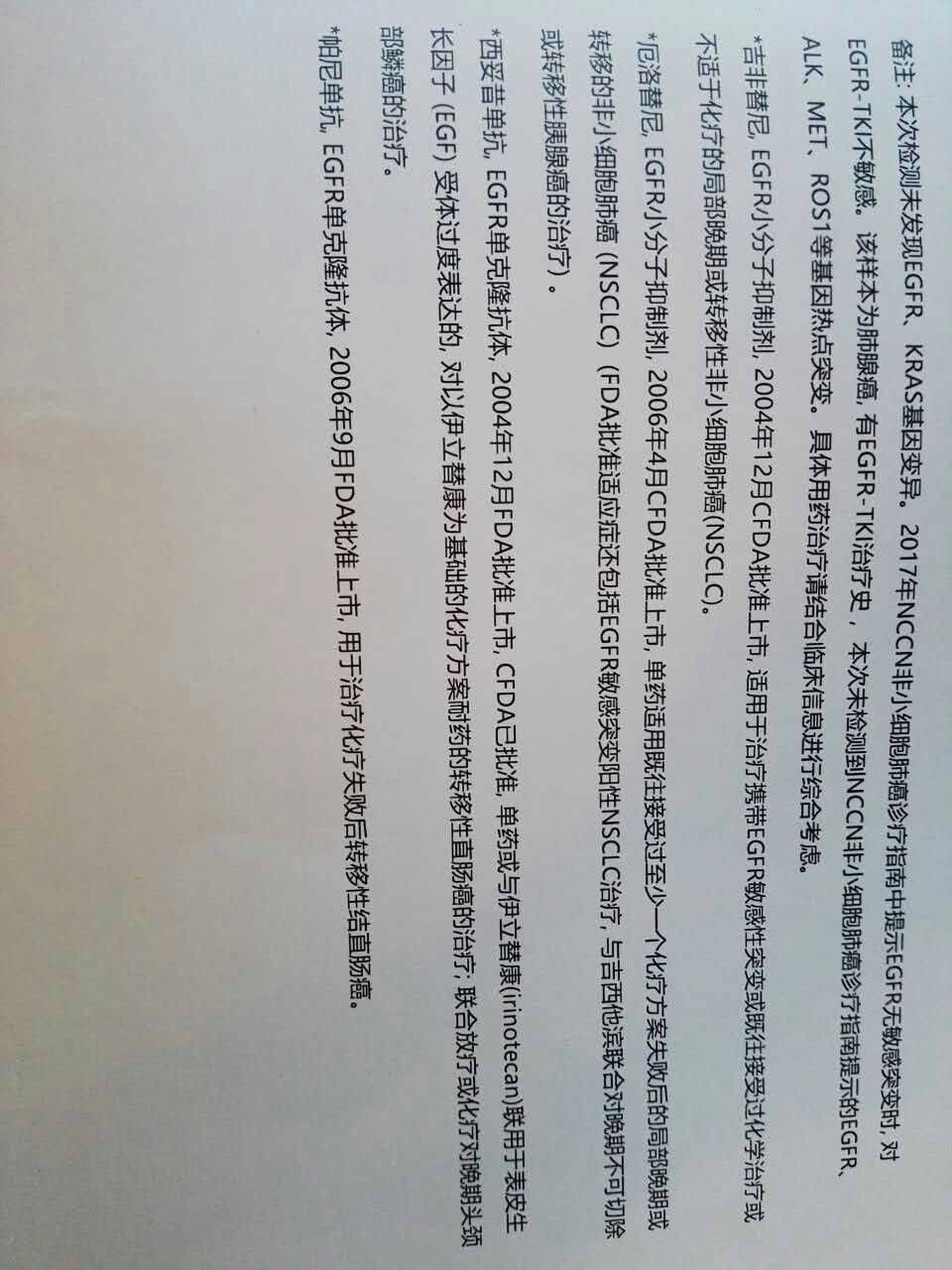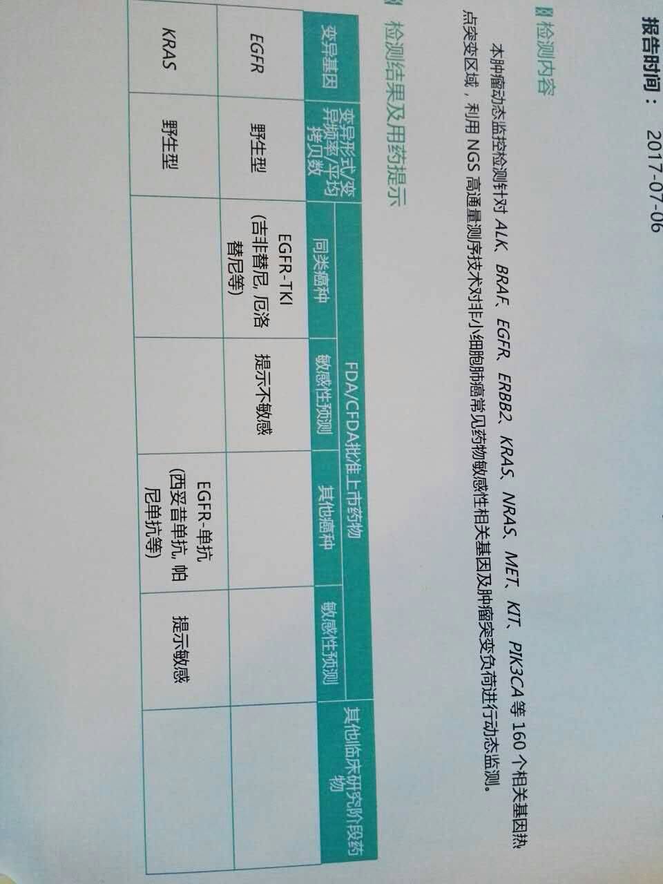 用血液基因检测,结果没有靶向药吃,用力比泰和顺铂化疗已耐药,最近又进行了PET/CT检查,下周二看结果。易瑞沙又吃了14天,结果CEA又上升了11个达到126.1,吃了一周广安门中医院的中药老头感觉很好。我把老头的基因检测报告发给大家,请大家多给指点,谢谢!